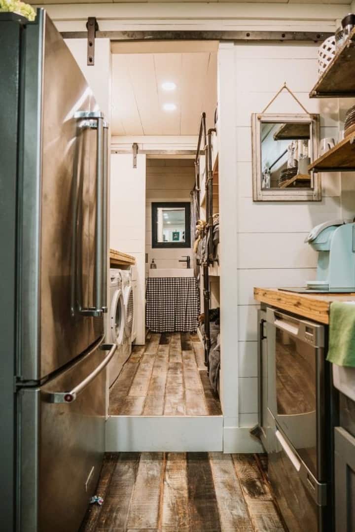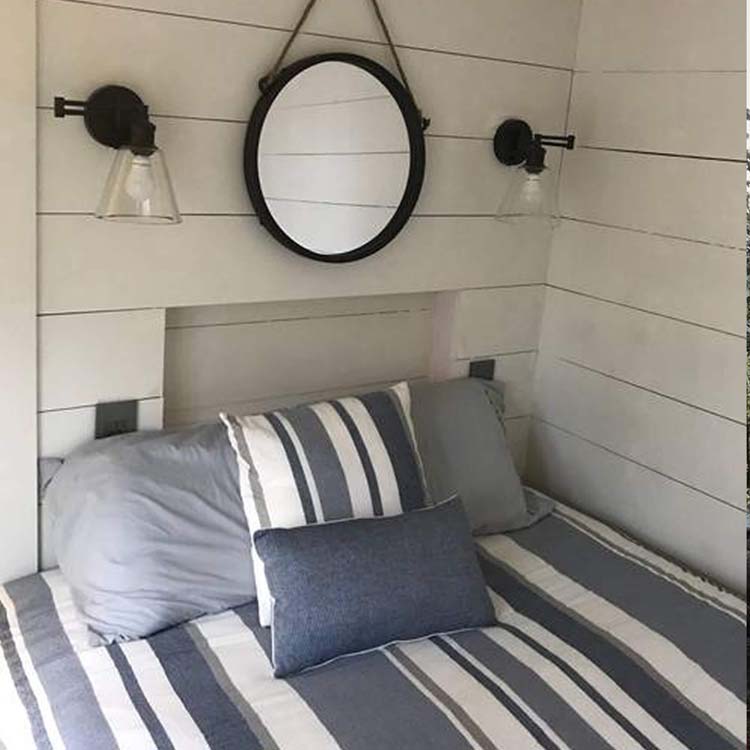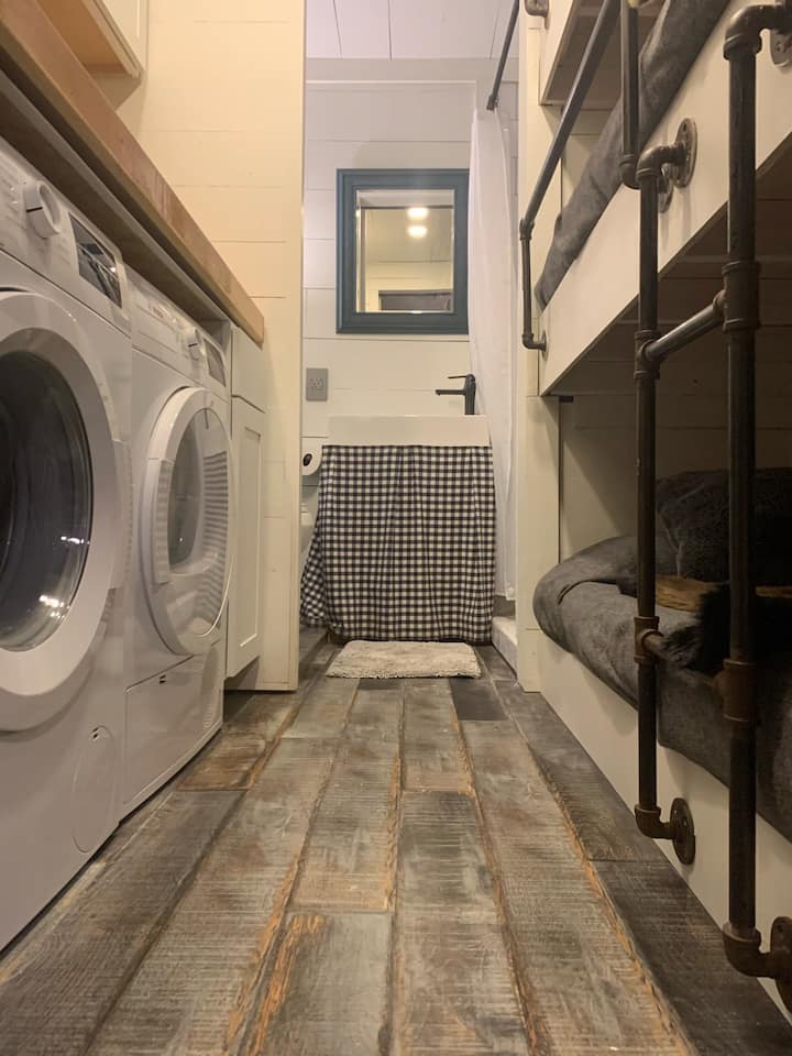 The size of the home is a bit deceptive as it uses two 20ft containers underneath one 40ft container, and yet only the 40ft container is livable space. Inside, you’ve got a bathroom and small kitchen, three bunk beds and a queen bed, plus a small living room with a couch.
