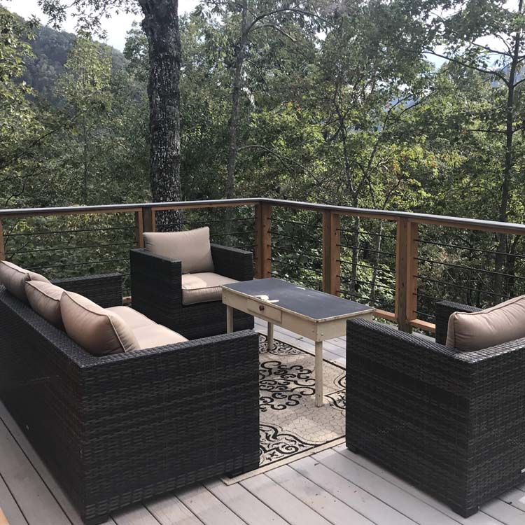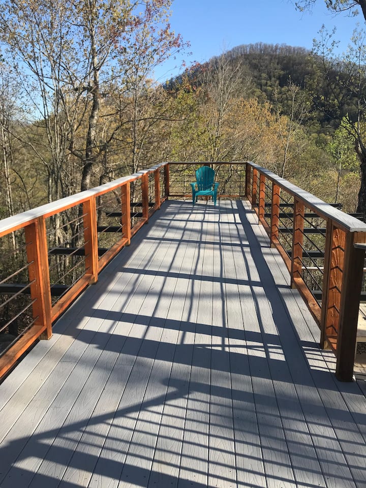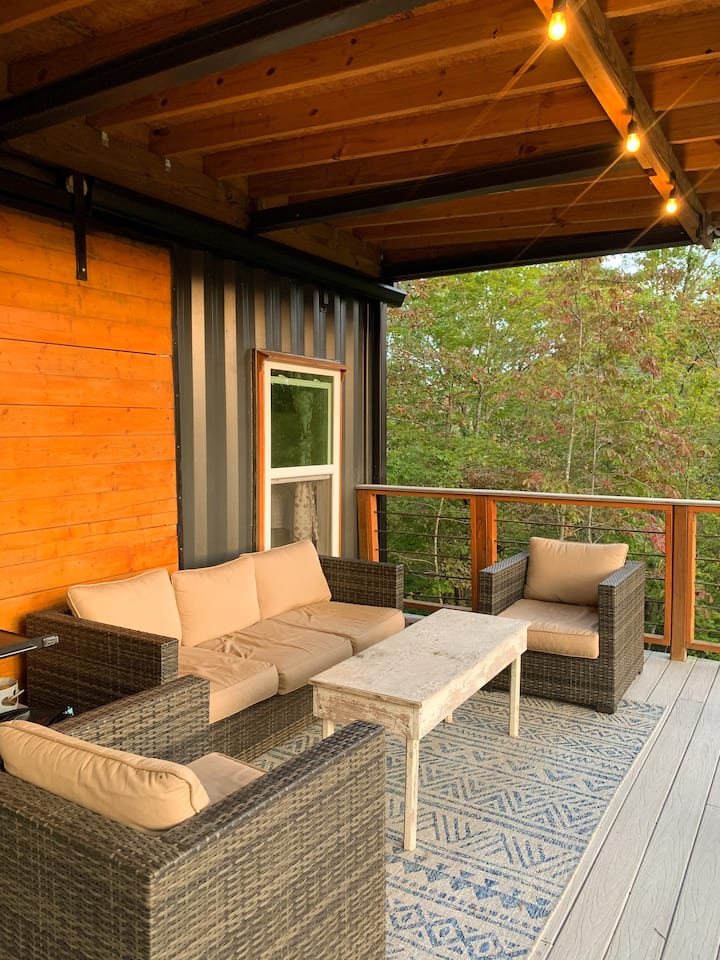 We recently added a roof to our cabin that allows us to enjoy the outdoor space when it’s raining – and it rains quite a bit in the Smokey Mountains!  The cabin allows us to enjoy all the amenities of a modern HGTV-style home when we are inside and to take in the unobstructed long range views of smokey mountains when we are outside.