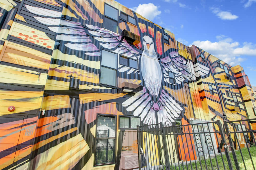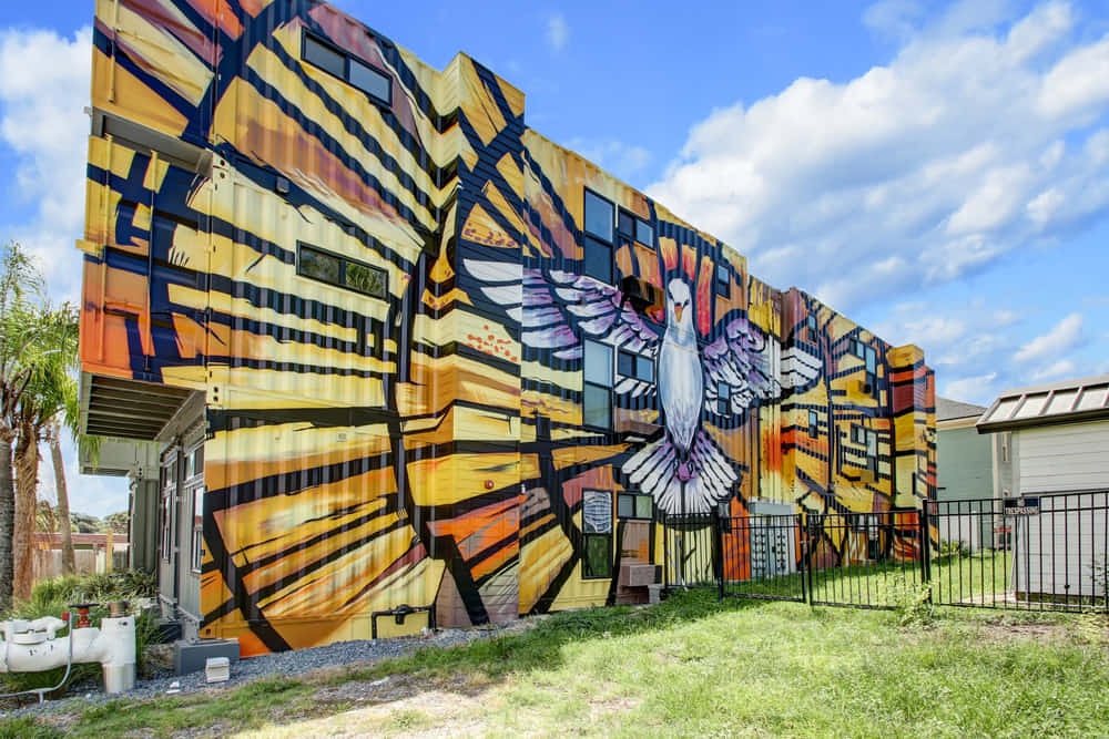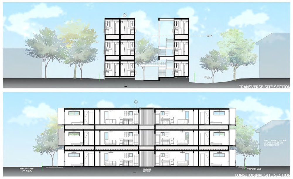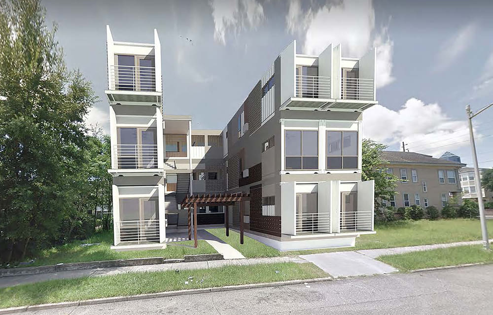 This container apartment complex sits in the Cathedral District of Jacksonville, Florida. This east-central neighborhood, named for its many churches such as St. John’s Cathedral, is a strategic location. It’s close to the riverfront, city center, and stadium district.