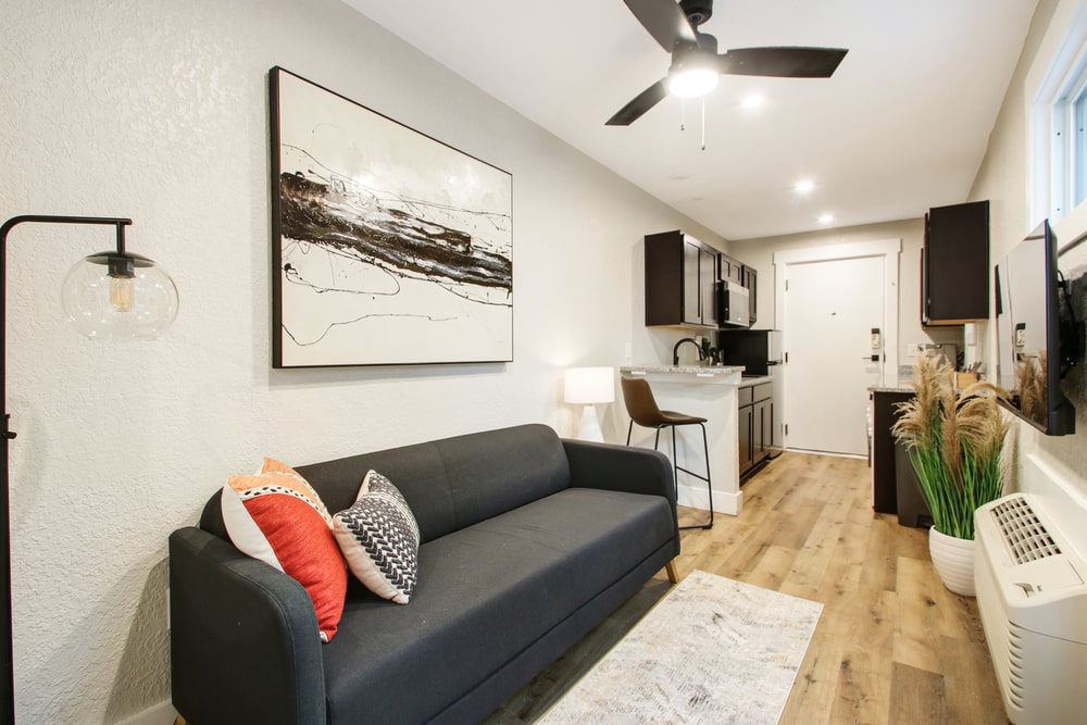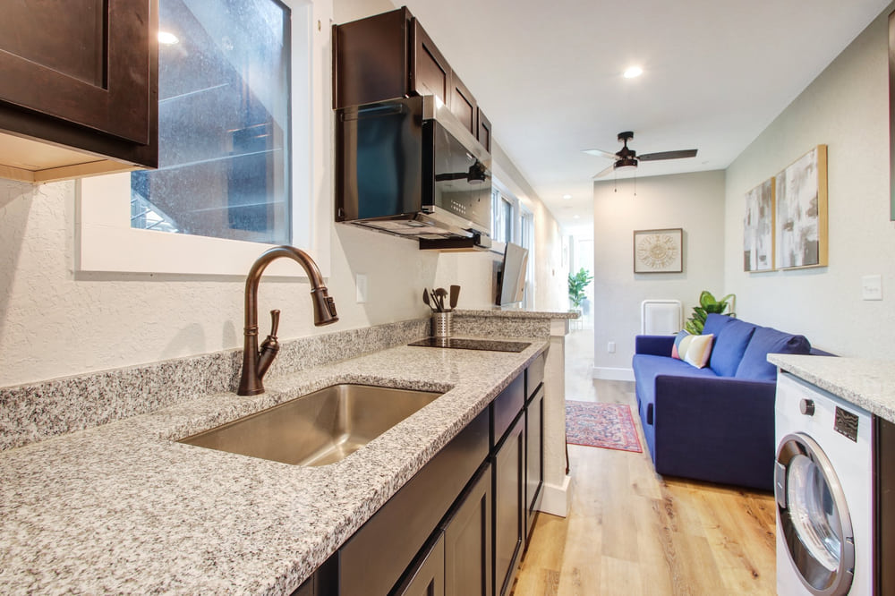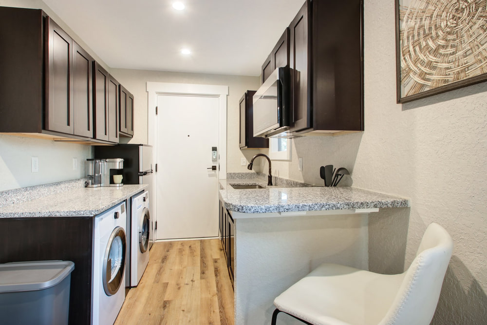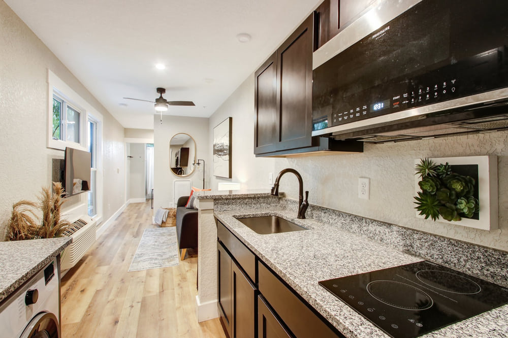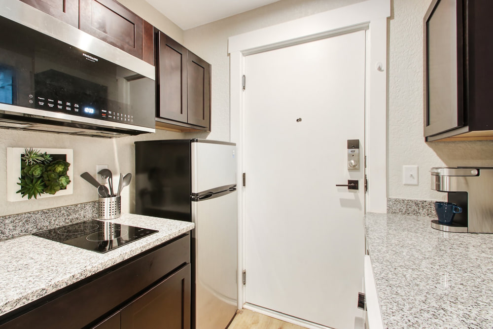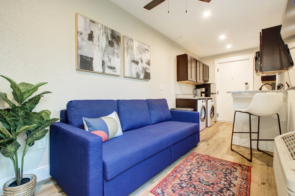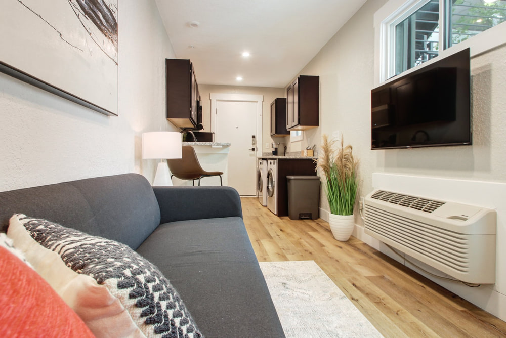 With only 360 gross square feet to work with (less if you’re counting useable space), you can’t have everything. What you can have is a workable floorplan including a kitchen with all appliances and even in-unit washer dryers. You get granite counters, attractive cabinets, and modern bathrooms. And the satisfaction of knowing you live in the hippest building in town, with a three-story outdoor mural to prove it.