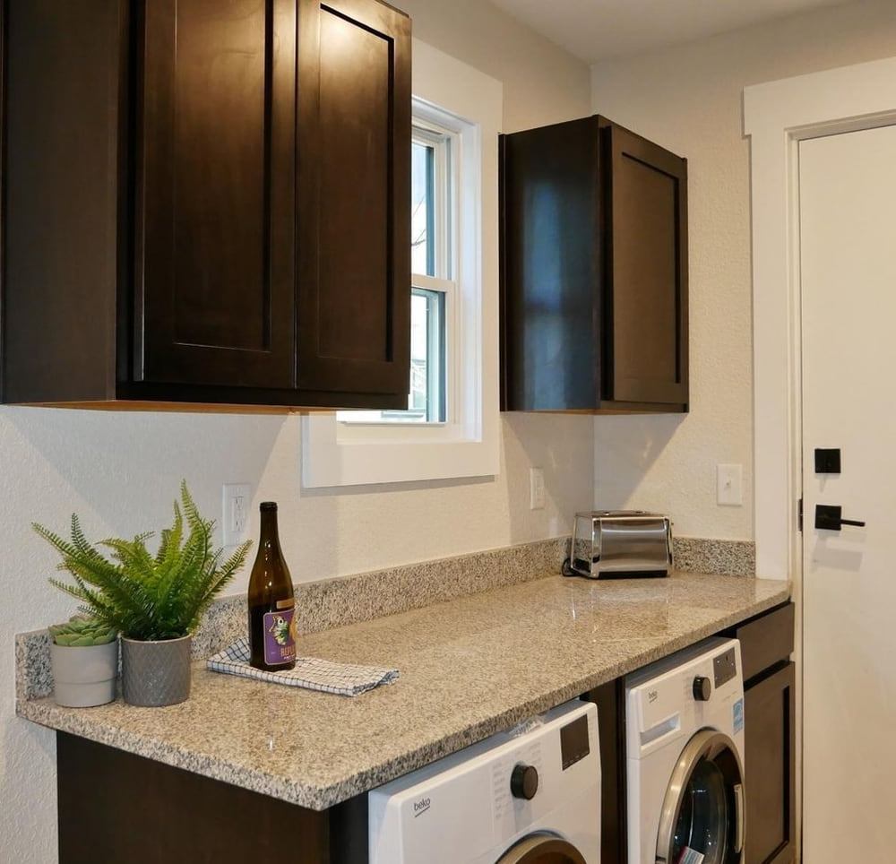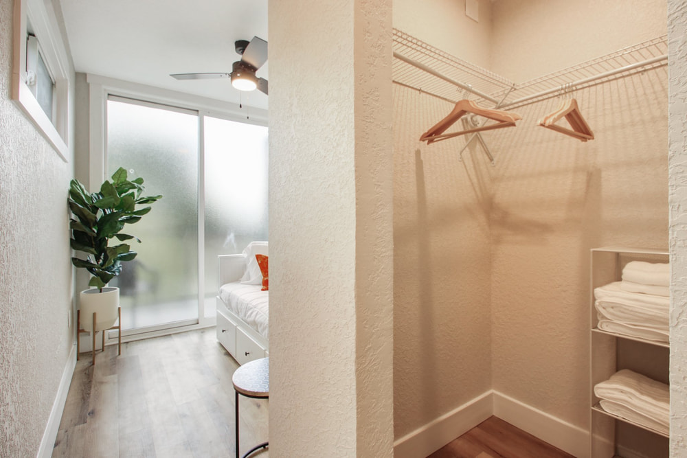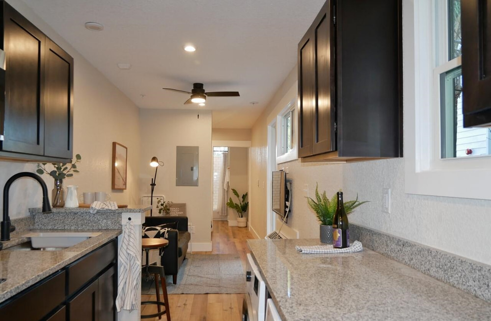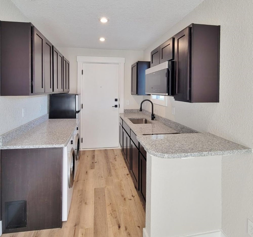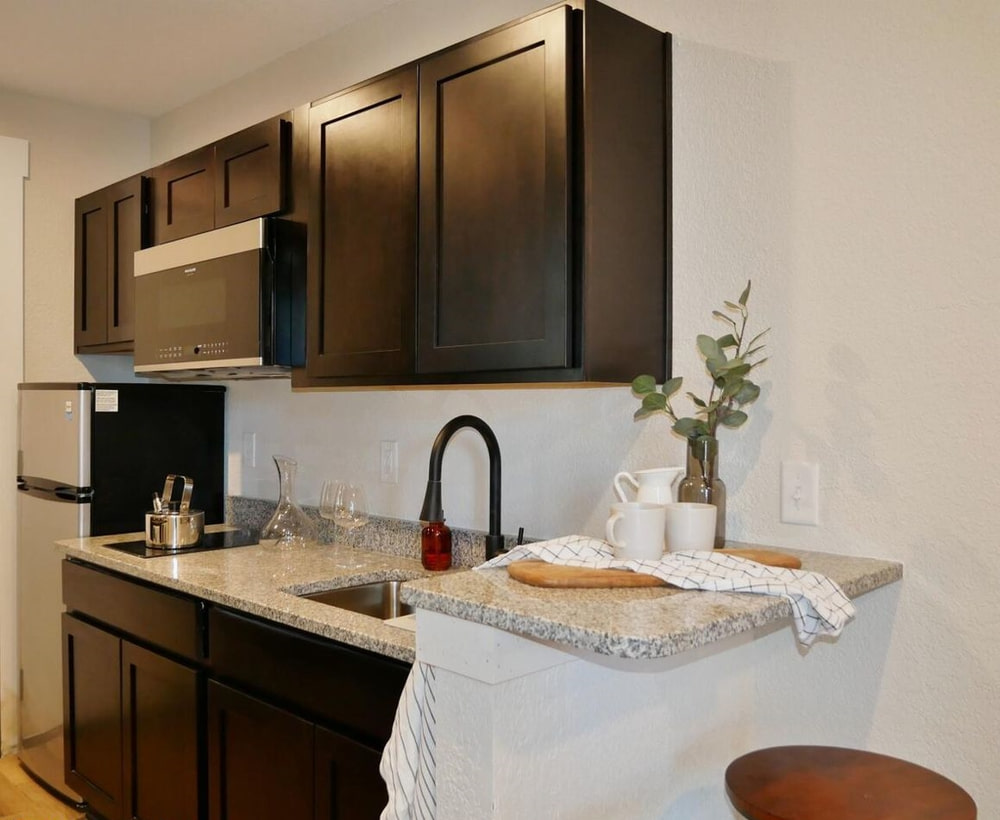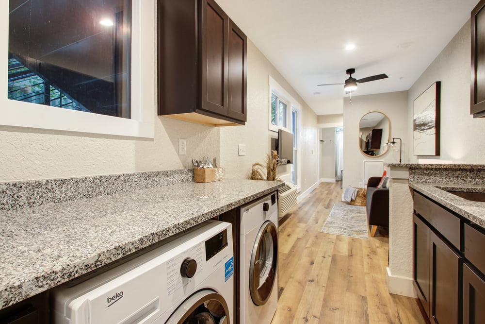 With only 360 gross square feet to work with (less if you’re counting useable space), you can’t have everything. What you can have is a workable floorplan including a kitchen with all appliances and even in-unit washer dryers. You get granite counters, attractive cabinets, and modern bathrooms. And the satisfaction of knowing you live in the hippest building in town, with a three-story outdoor mural to prove it.