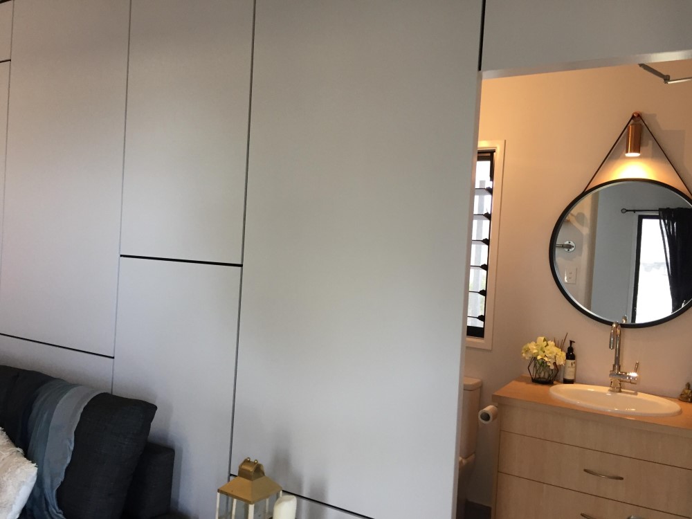 On the interior, I have a couple of notable features. First is the downstair bathroom, which is access via a hidden door along the lounge room wall. Doing away with the normal door gives the illusion of more space and always makes for a fun conversation with guests.