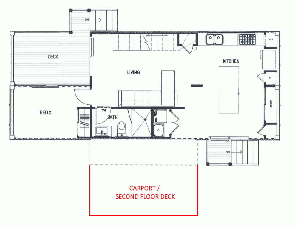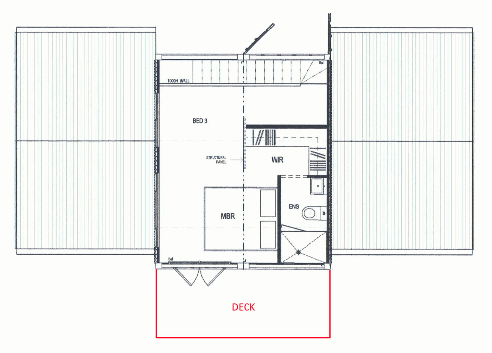 We ended up deciding to add a deck off the main bedroom after we had already finished the design documents (so the deck was conceptually added in red to the plans as you can see). It performs double duty as a covered carport.