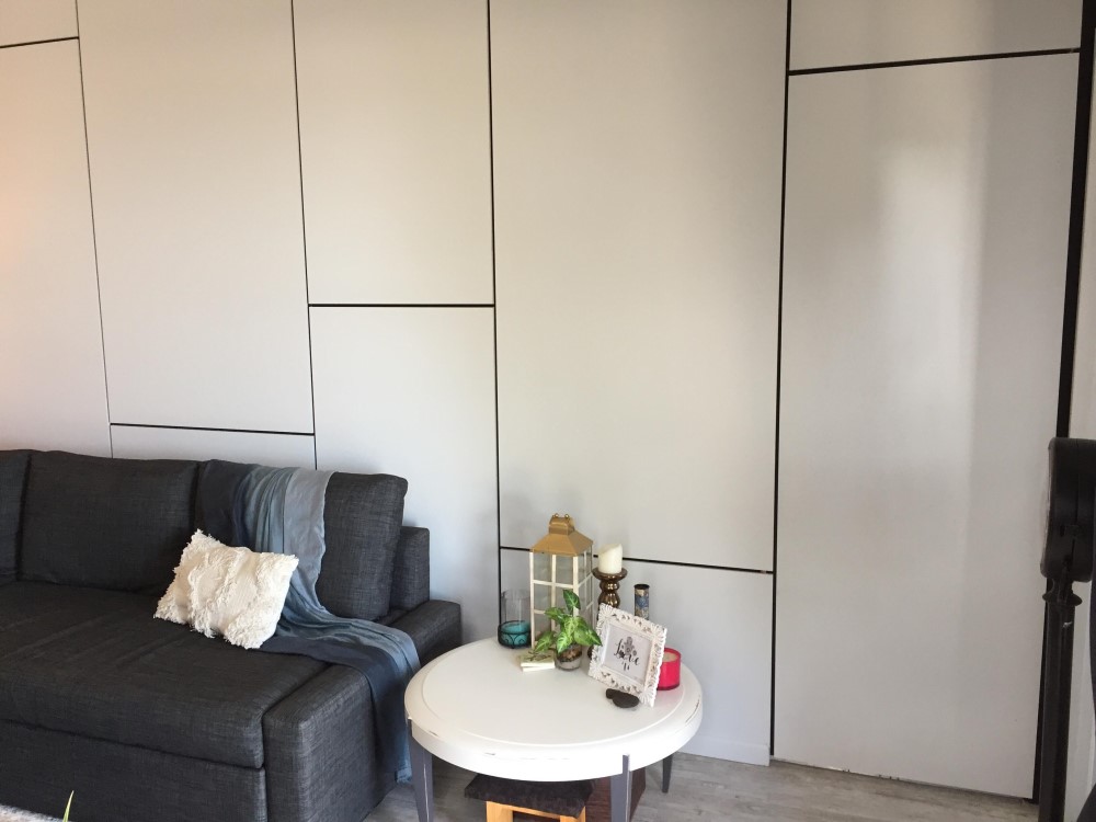 The worker building the kitchen cabinets just cut additional panels of the laminate-covered MDF to cover the walls of the lounge room and the bathroom door.