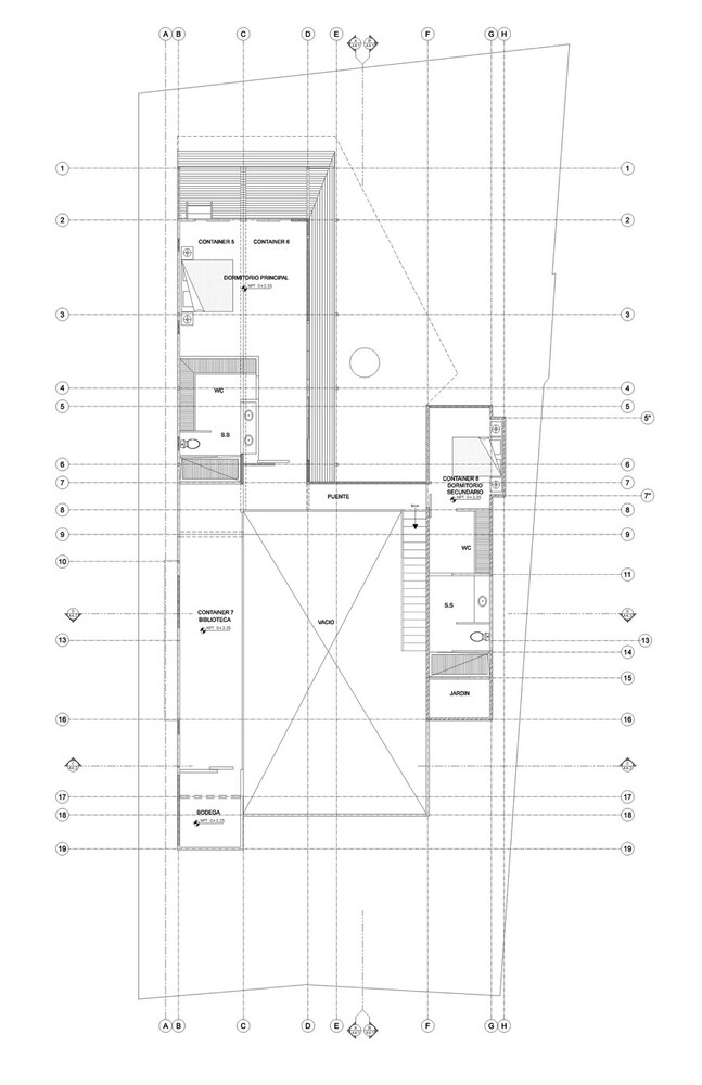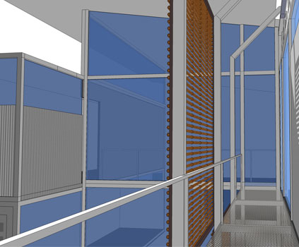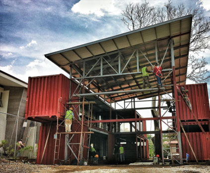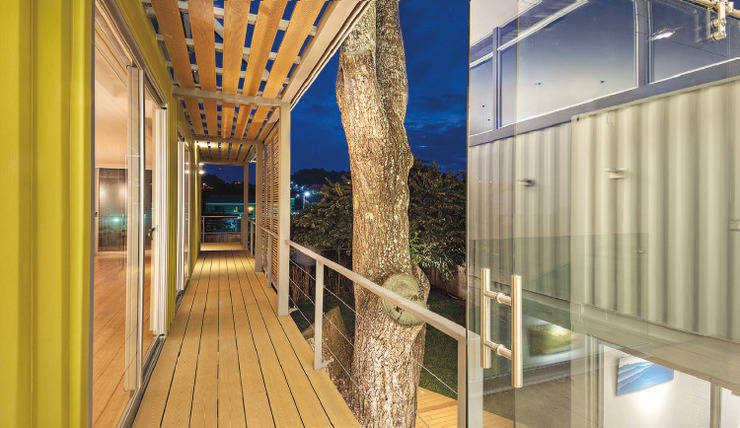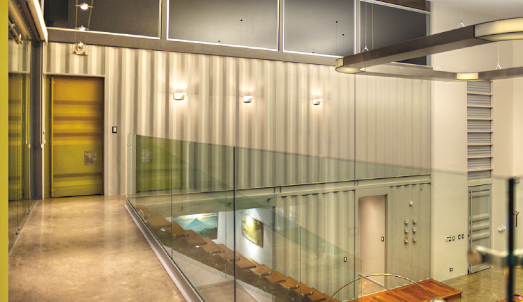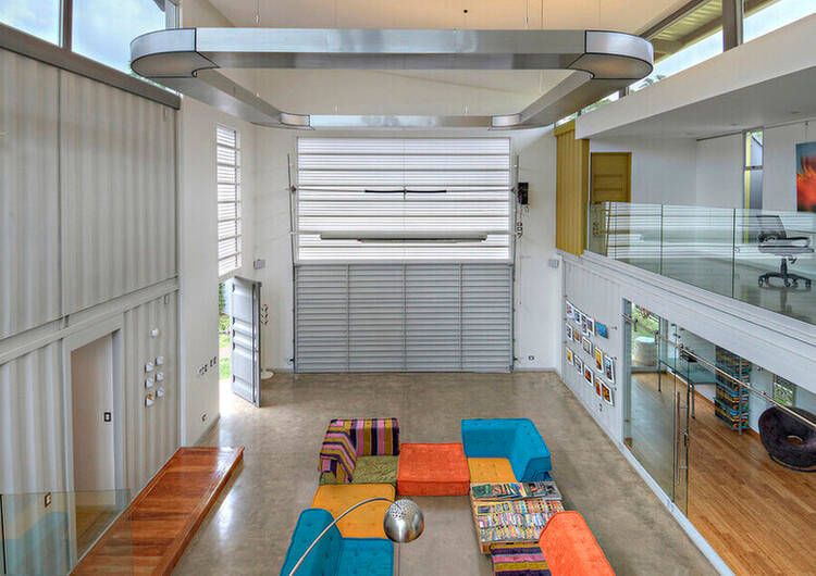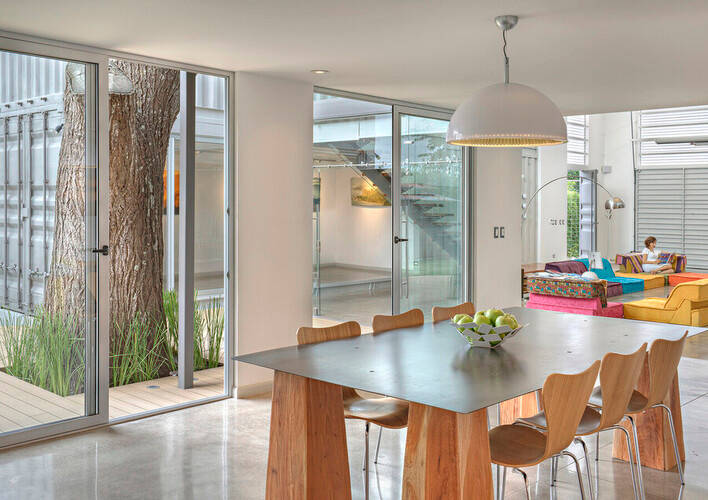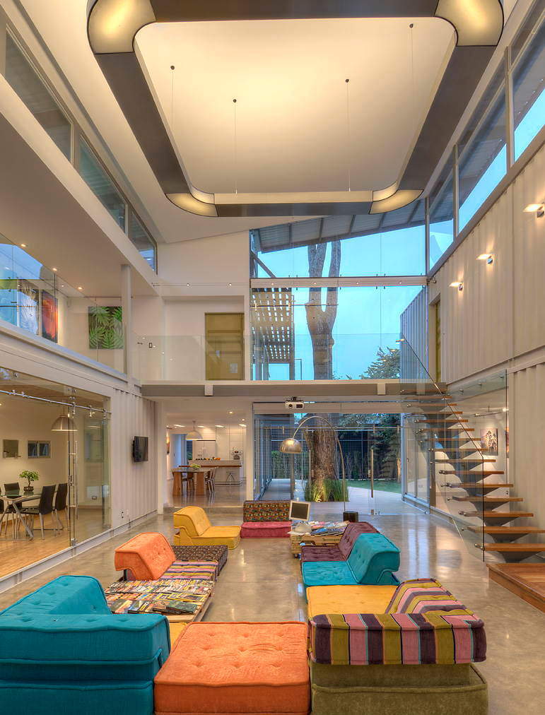 Achieving that meant segmenting the home into both public and private areas. The designer achieved that by stacking and orienting a total of eight 40-foot containers with a large gap in between two parallel banks. With a roof placed over the gap, the containers formed the long sides of the space.