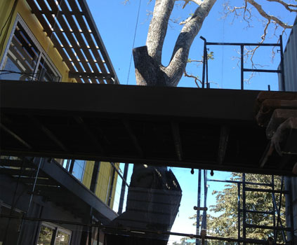 During the home’s construction, several limbs of the tree needed to be trimmed. The limbs were later milled into lumber and repurposed as dining table legs, stair treads, and other home features.