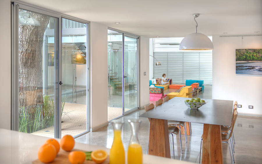 But the central, open room also has an additional function. The other areas of the home, both public and private, all tie into the main area, allowing it to not only share light but cross-ventilation of air. This is especially true when the massive garage door on one end of the room is opened.