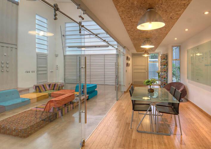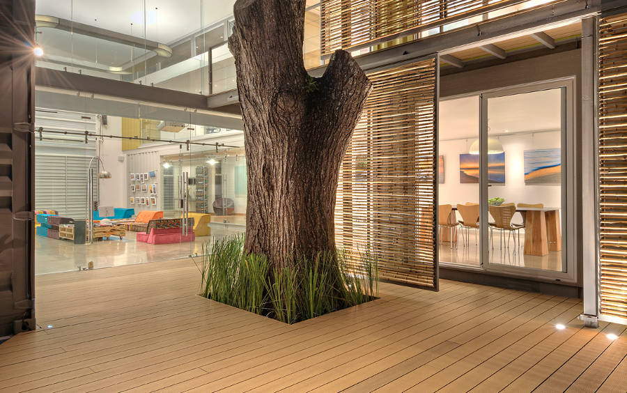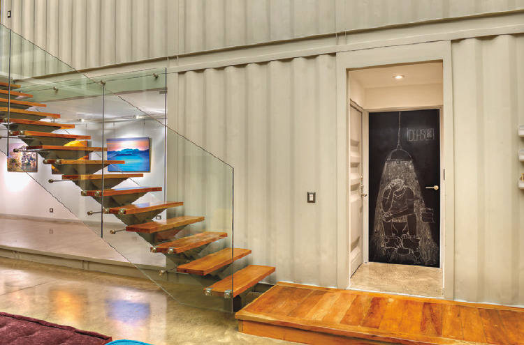 And while it’s not technically wood, the flooring in most of the container-based areas of the home was made with warm bamboo, a resilient, sustainable material choice. The walls are mostly traditional gypsum board, save for the exposed areas of the container you see in some rooms.