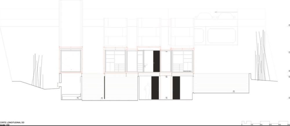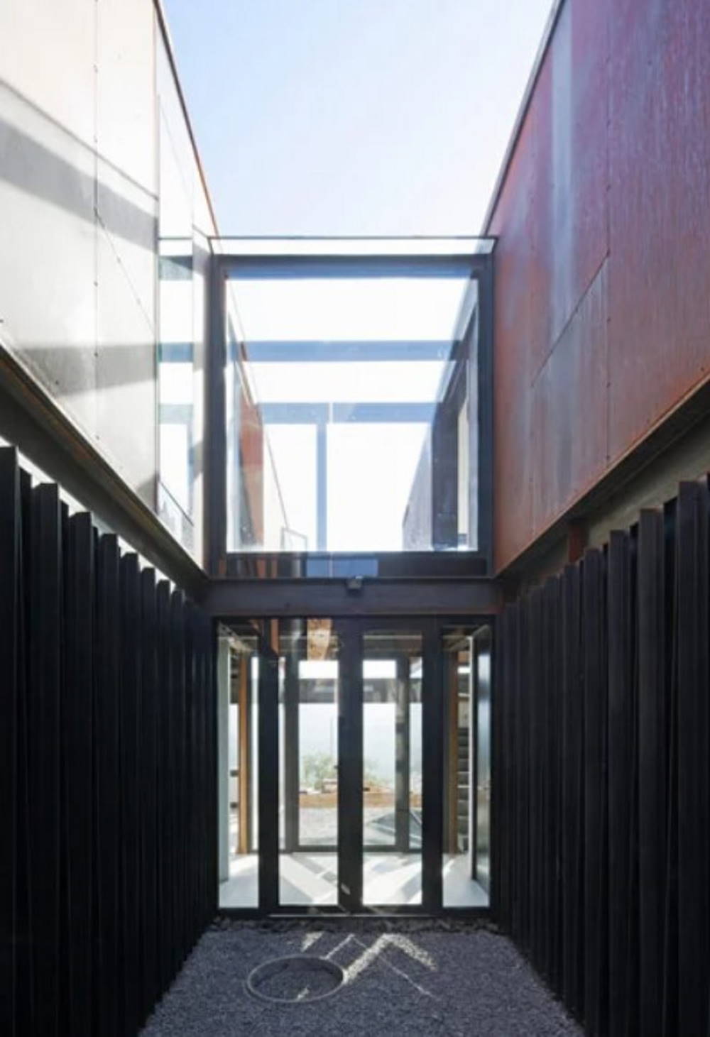 Most of the shipping containers are actually used above on the second level of the home. In this way, the containers, along with the narrow areas between them, become the roof of the first floor. Along with gallery areas, the containers also form the private areas for the resident, such as bedrooms and a bathroom.