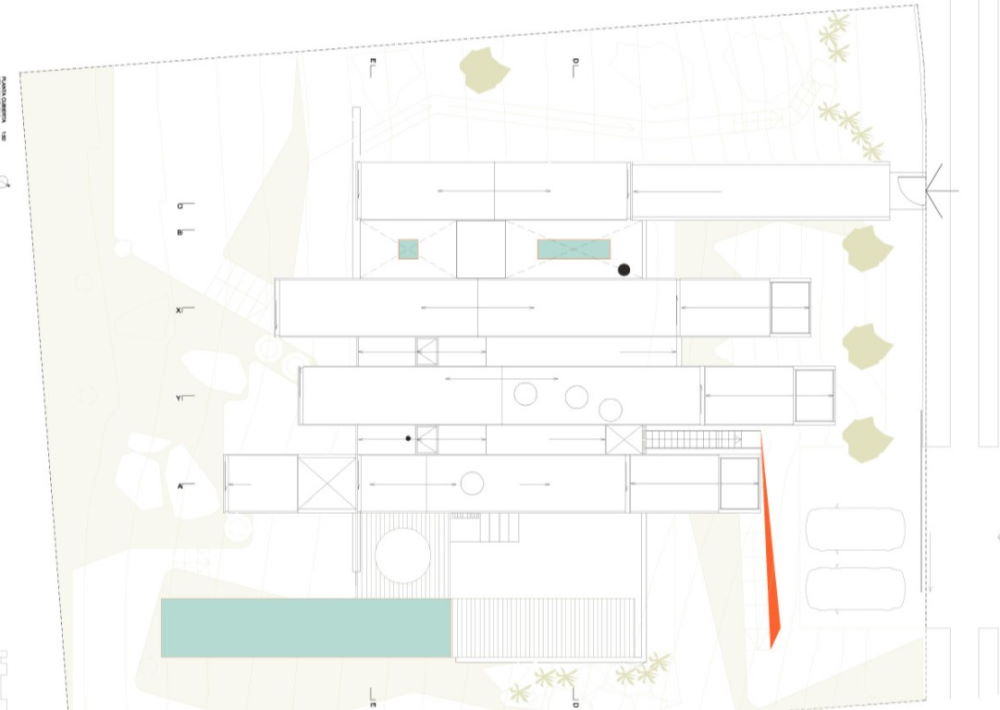One look at the house clearly shows the containers are not all placed in the same plane. Rather, several of them start near the car parking area, then slope down the hill toward the house. The containers then turn to jut out horizontally from the hill.