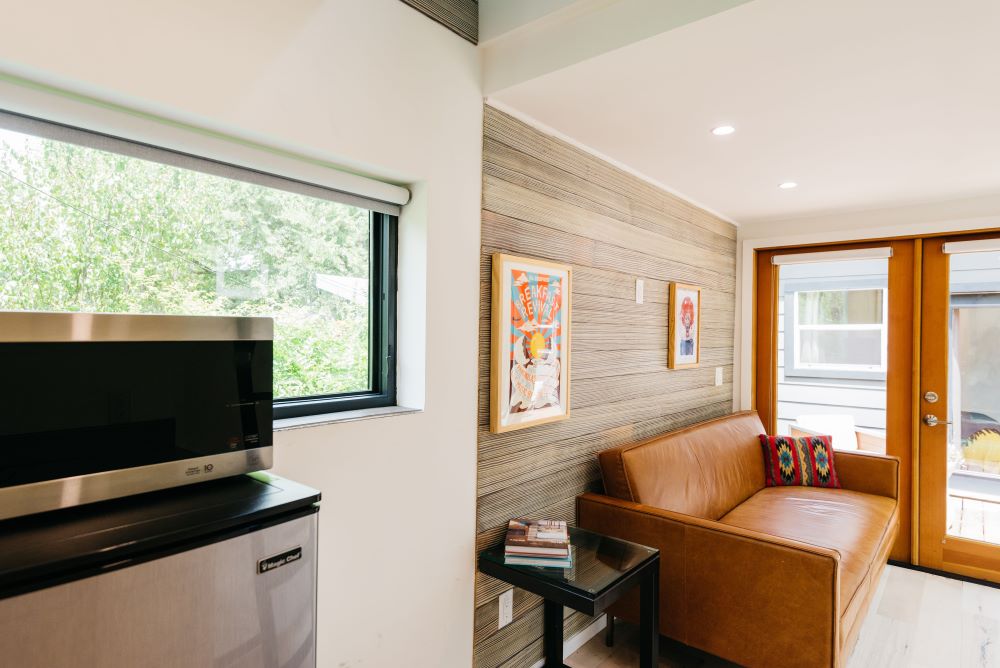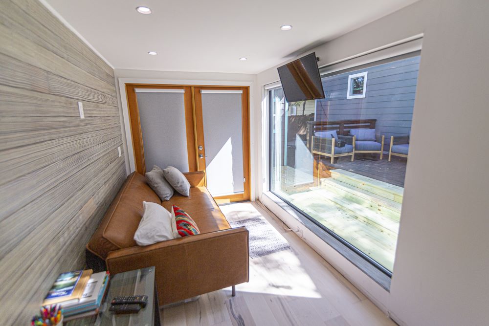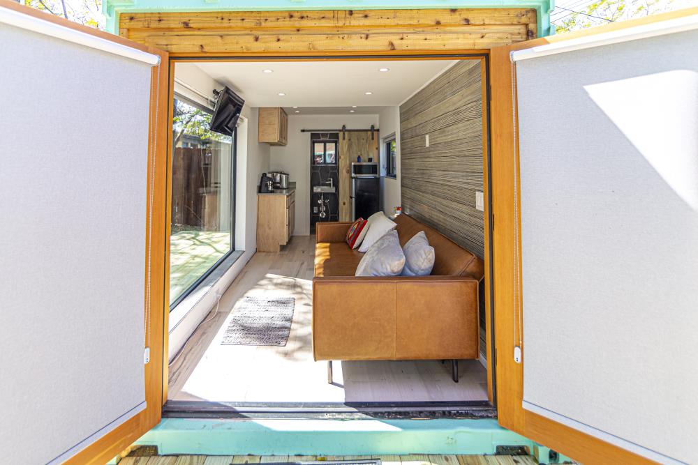Your eye probably catches one of two things about the house, both of which are worth describing in detail. First is the absolutely huge picture frame window that takes up almost half the side of the container. Together with the glass front doors on the end of the container, this window brings in tons of natural light.