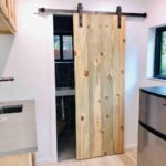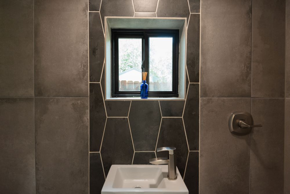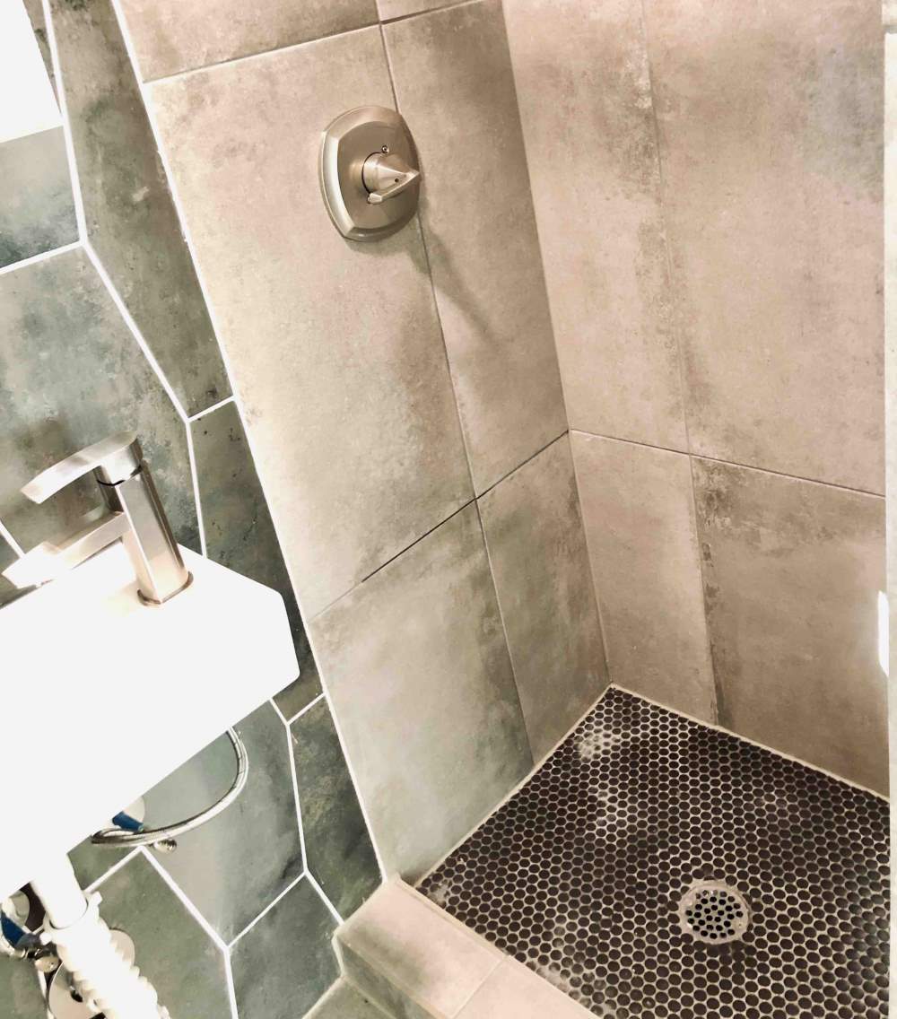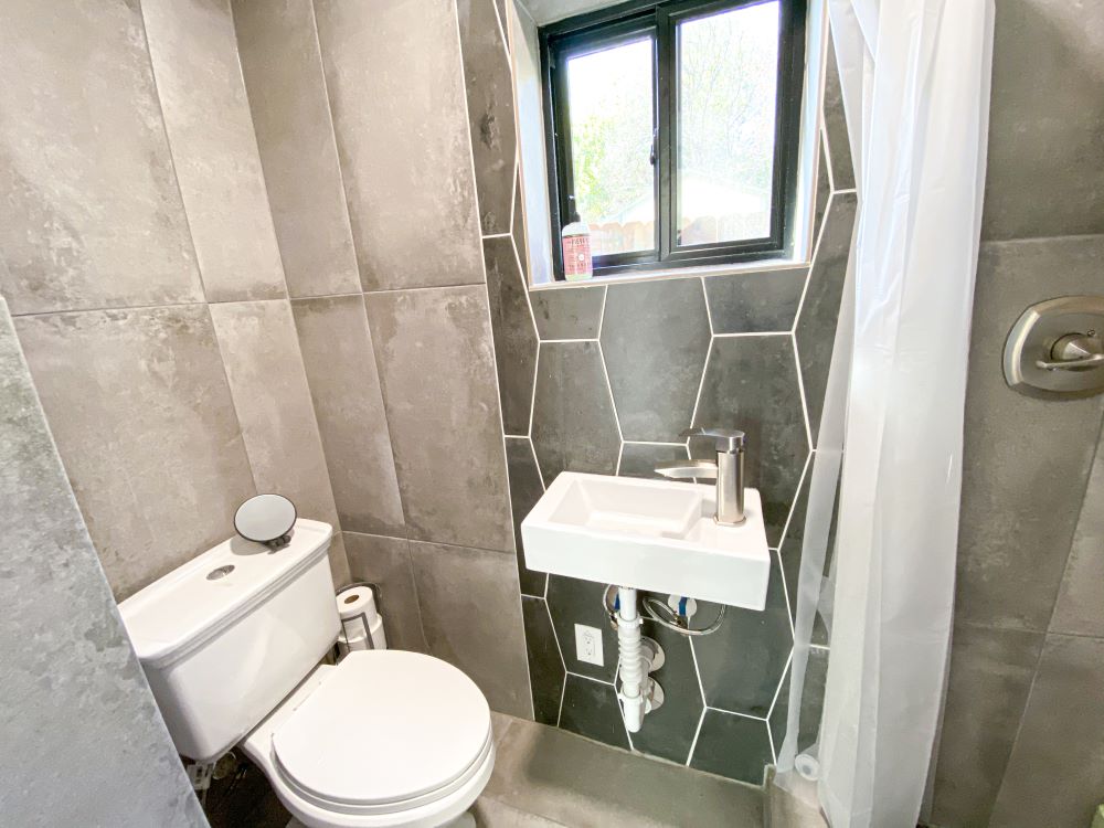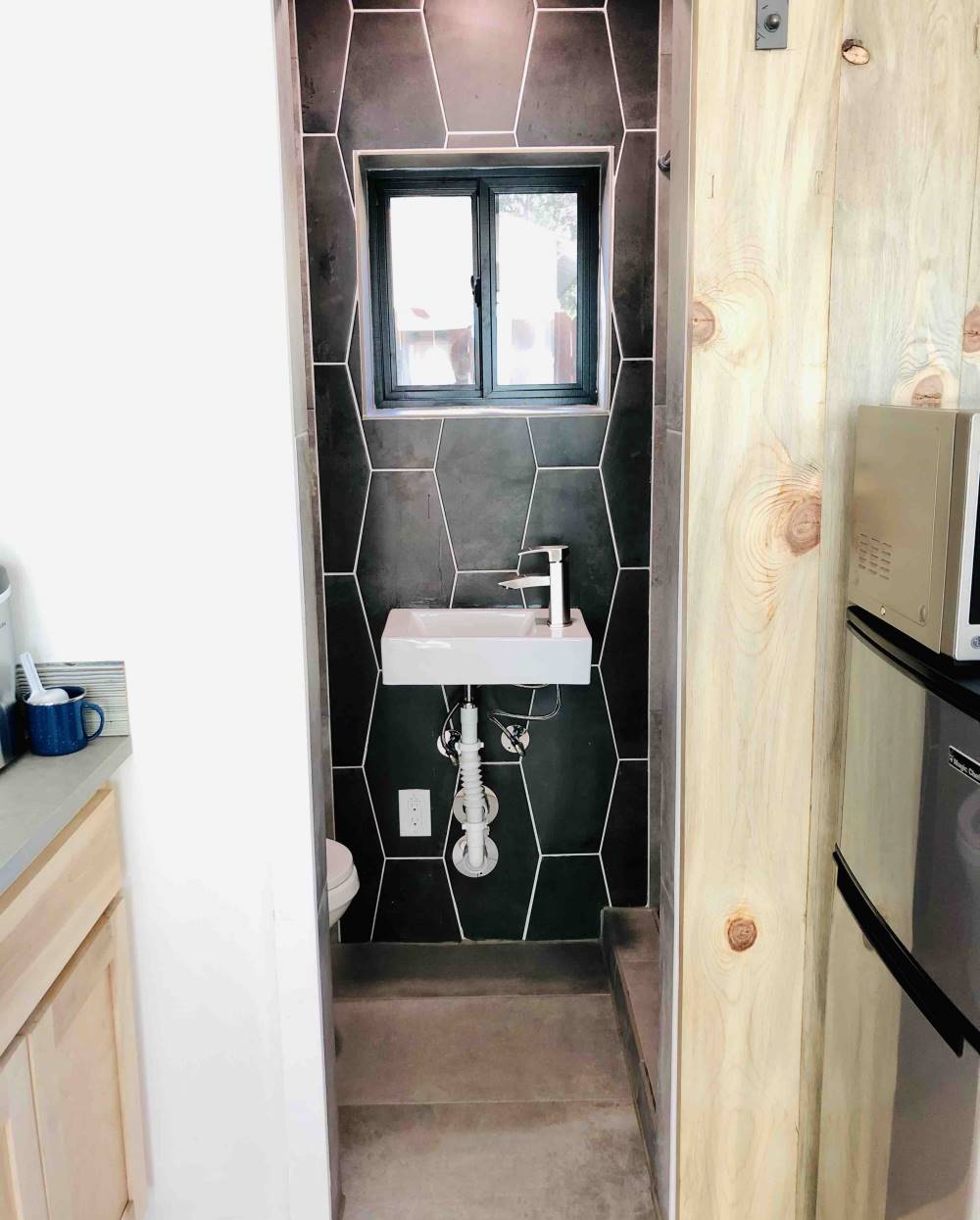 A wooden barn door slides open to access the bathroom at the far end of the container. Here, elegant gray tile continues the industrial aesthetic that still hints at a touch of luxury. The bathroom is small but still offers a walk-in shower, small sink, and toilet.
