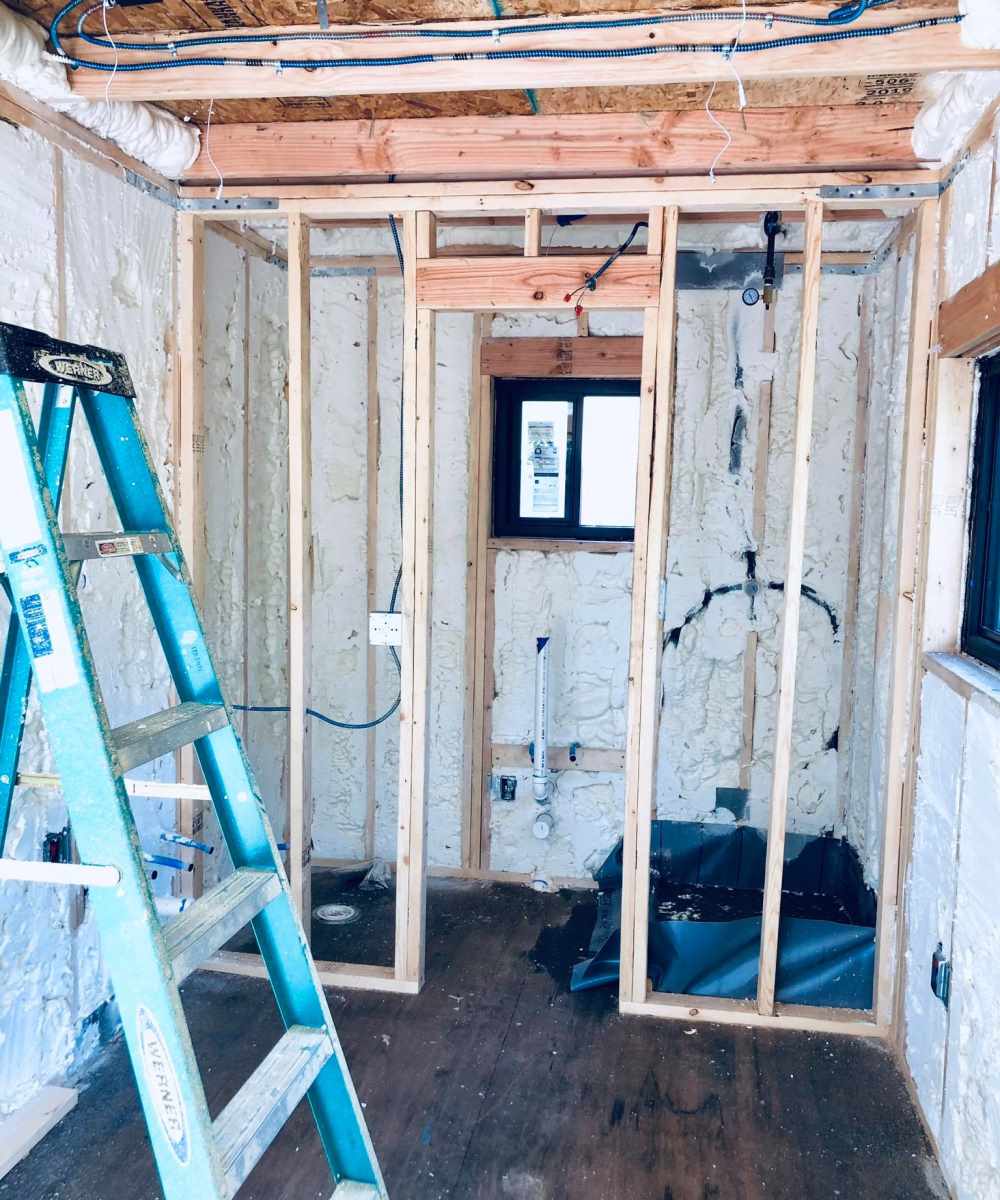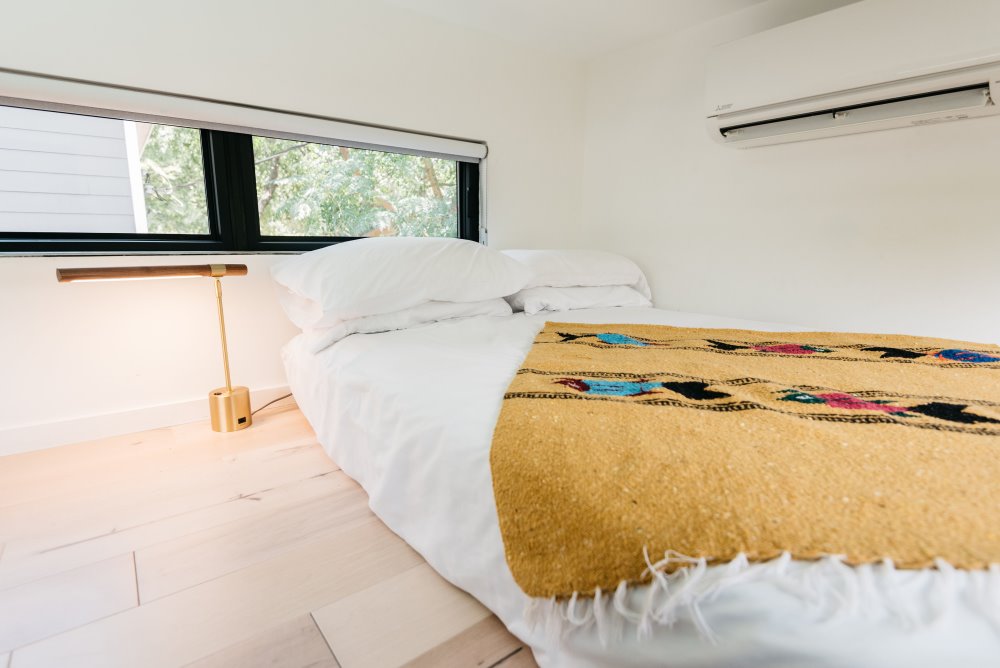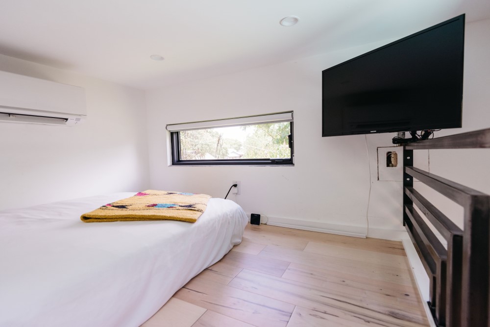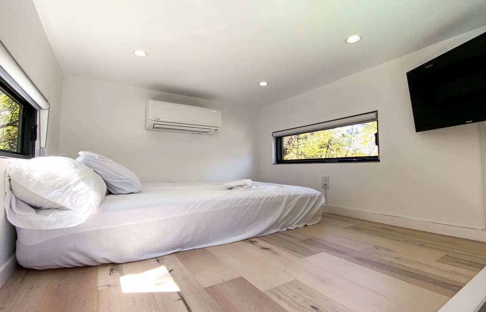 Once you climb up the ladder, you’ll find a mattress laying on the floor of the loft with quite a bit of room to the side between it and the custom railing. Up here, there’s another wall-mounted TV if you’re too tired to make it down to the living area. And the mini-split HVAC unit is up here as well, ensuring an optimal temperature for your sleep.