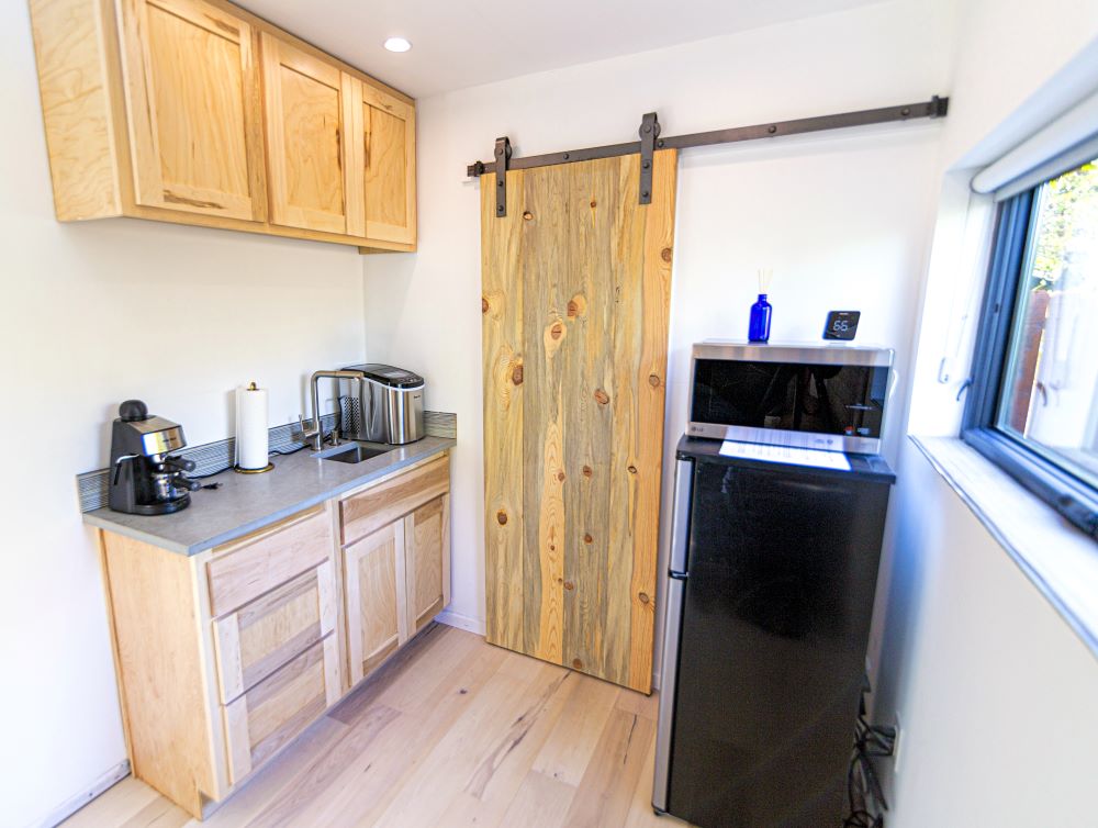 Adjacent to the living area is the small kitchenette, with a dorm-size refrigerator, small sink, and limited cabinetry. You’re not going to be doing much cooking here, but with tons of restaurants in the area, most guests probably wouldn’t want to cook anyway.