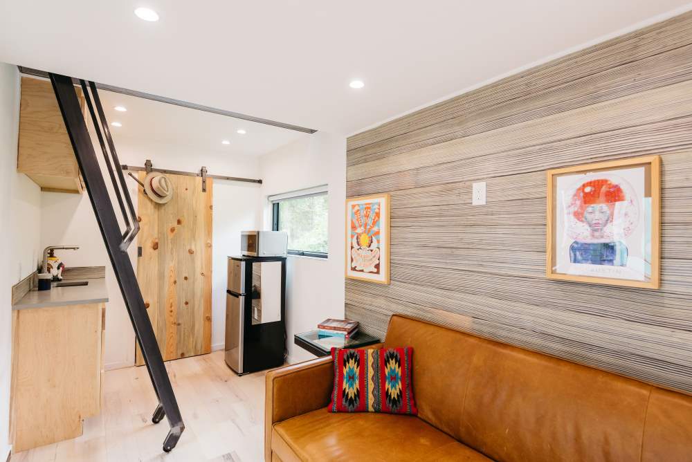 Granted, anyone with impaired mobility is going to have trouble accessing the near-vertical ladder that leads to the loft. Luckily, this container rental unit also includes a fold-out couch that offers room for additional guests on the main level.