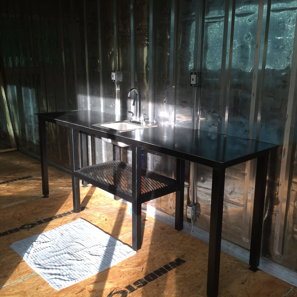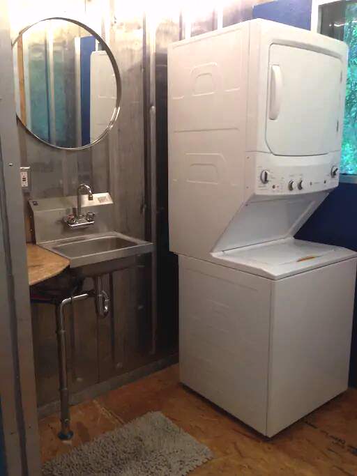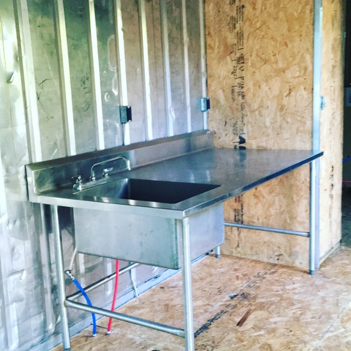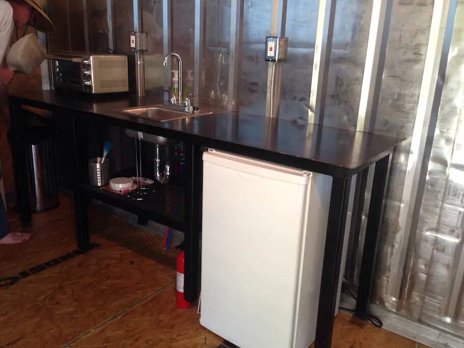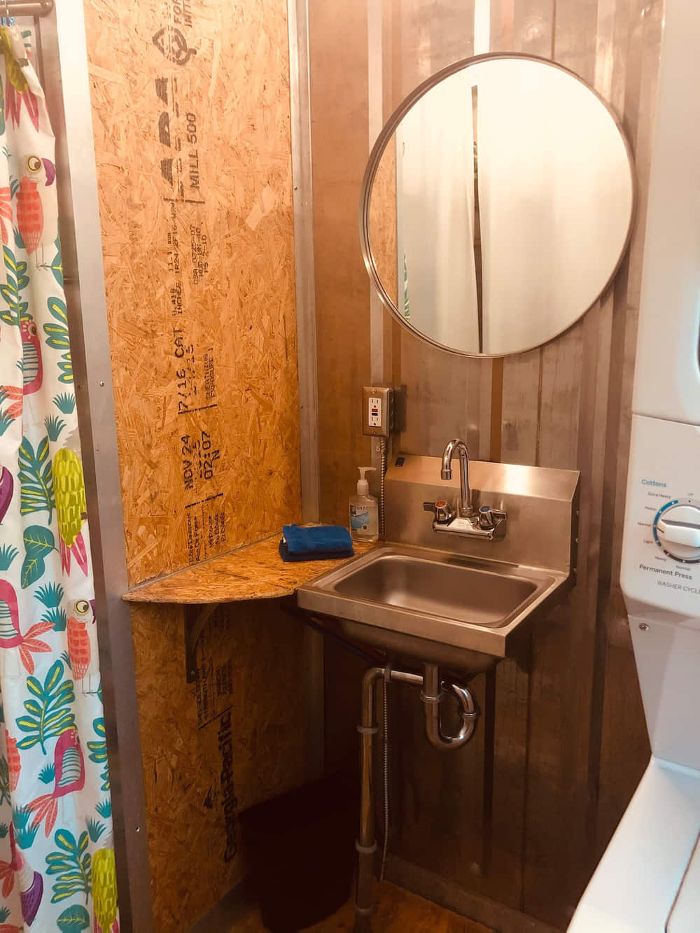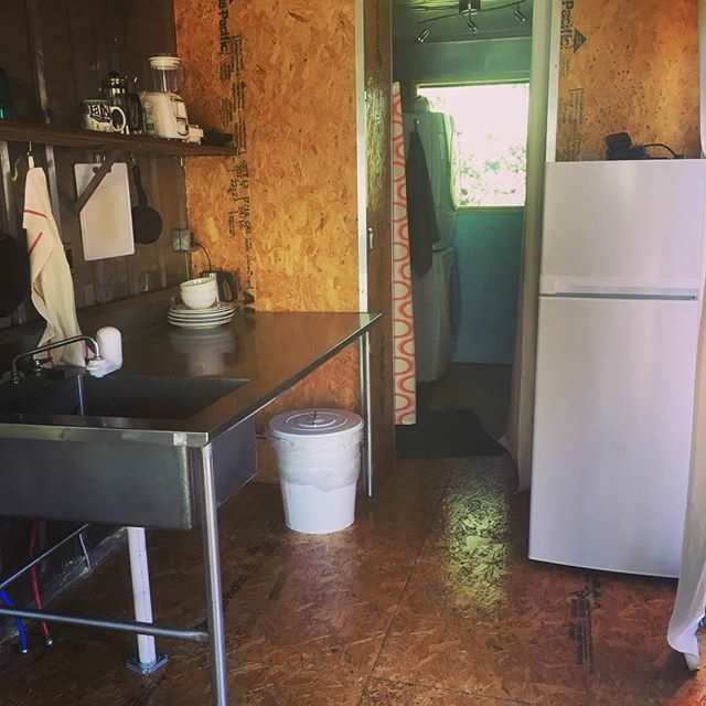 The last major difference between the two units is the kitchen area. I found a huge stainless steel sink from a restaurant that also makes for a bigger counter and working space. In the first unit, the sink is really too small to live with longterm but it works great for short term renting. I wasn’t worried about the size of the sink because my son (who eventually will get that container house) is not someone who cooks and most people who rent from us don’t do a lot of cooking either. The larger sink in the second unit is more suitable for long term living, but I still love the layout of both.