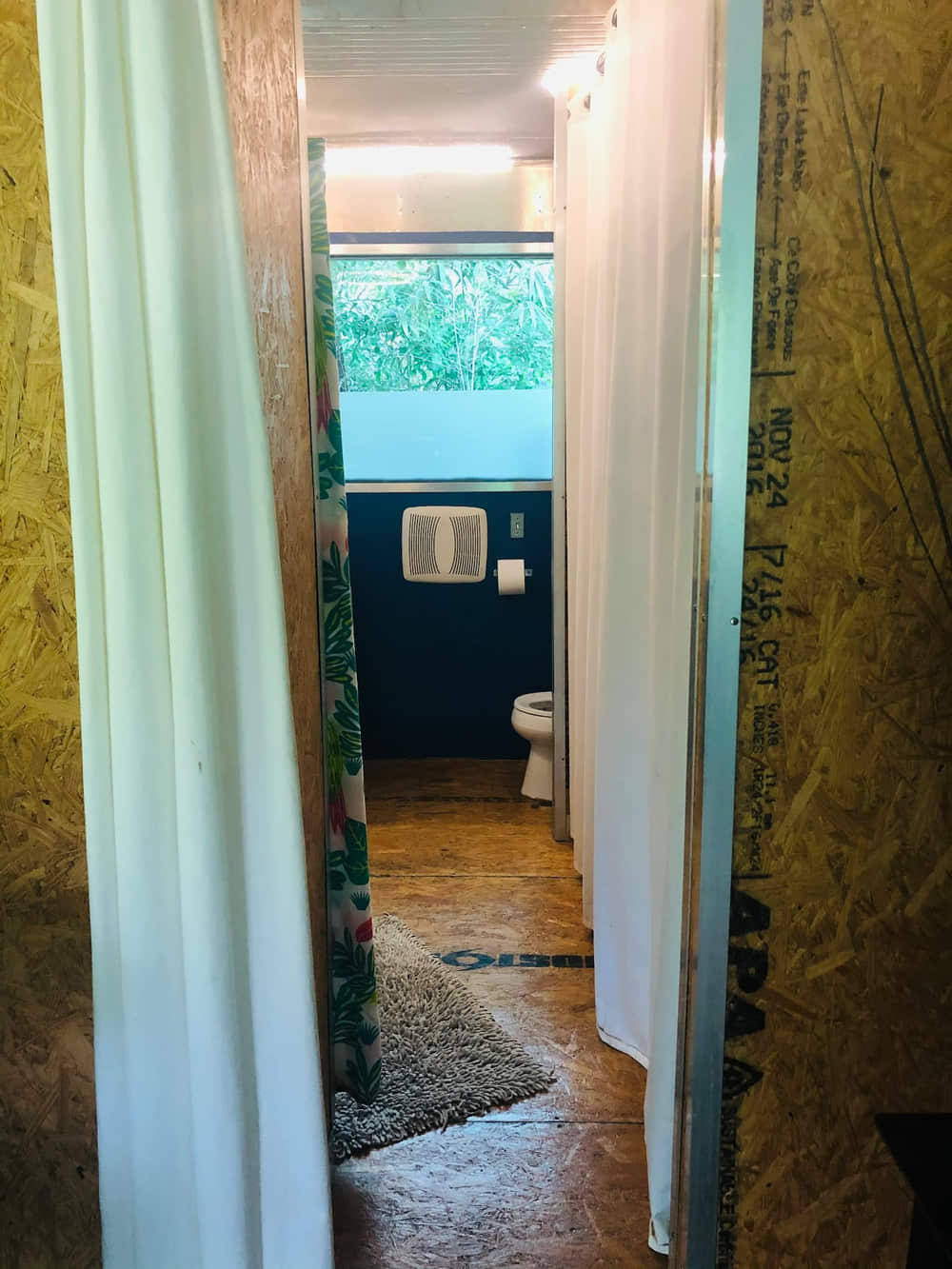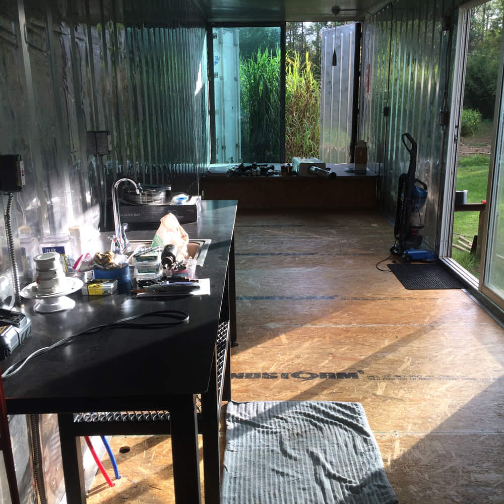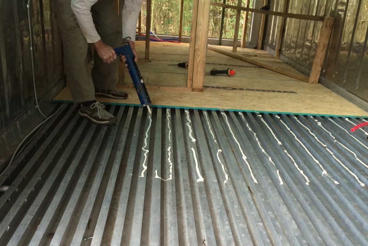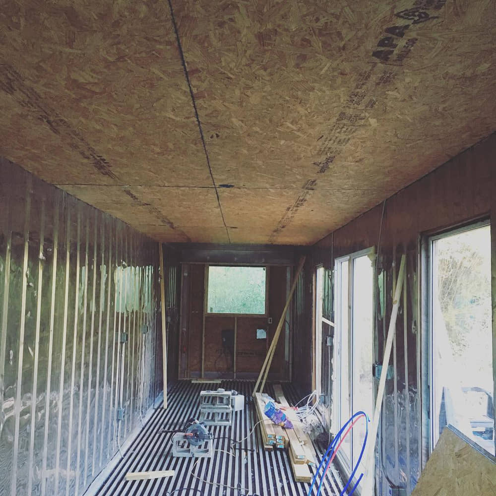 The floors of a refrigerated shipping container are aluminum T-channel which isn’t very useful for a dwelling. So, we covered it with Oriented-Strand Board (OSB) attached to the aluminum underneath and finished with a clear coat. The interior wall separating the bathroom is also covered in OSB to give a consistent look and for durability.