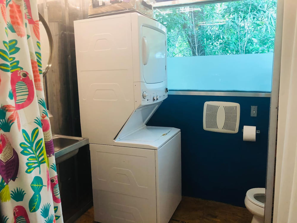 The second container house is very similar to the first one other than three small differences/changes. The 2nd unit has a slightly smaller shower. Due to the layout, a bigger shower means a smaller door into the bathroom. In the first unit, I added a washer and dryer into the bathroom, then built the wall and doorway afterwards. The washer and dryer couldn’t fit through the doorway, but my thinking was that in five years or so I could remove the bathroom wall to replace them. Well, two months into renting the unit the washer was broken by a guest and I had to have a repair man fix it on site. Luckily it was repairable in place so we didn’t have to take out the wall! Based on this experience, I made sure that the door to the bathroom on the second container house is big enough for the washer and dryer to fit through.