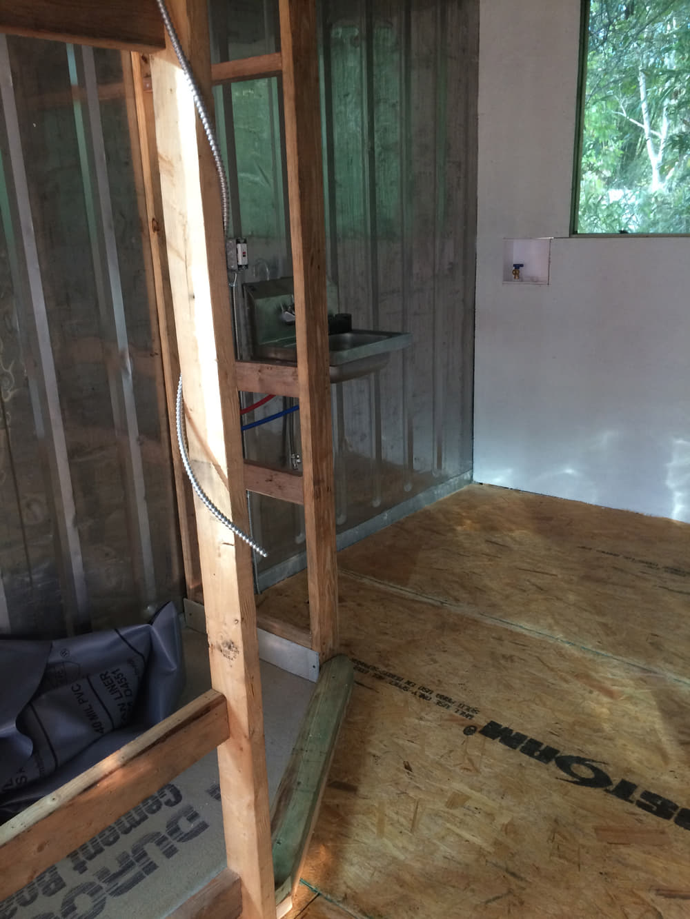 I built the inside of the units to accommodate a bit of flex in case I wanted to move the container to another location. For instance, the shower walls are Hardee board covered with epoxy.