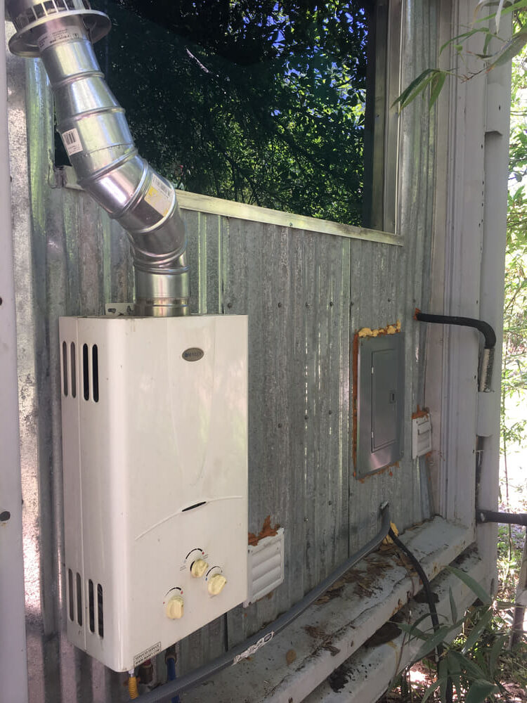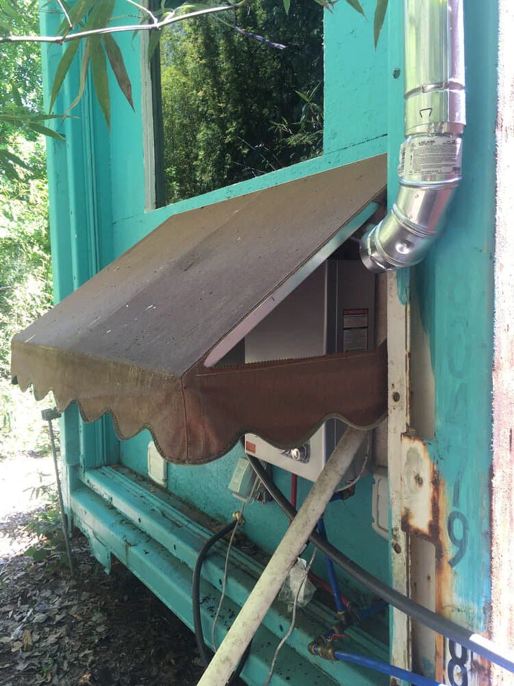 We placed the electrical boxes and on-demand hot water heaters on the exterior of the wall. On one of the container houses, I built a small roof over the water heater, and on the other, I covered the plywood sheathing with corrugated metal.