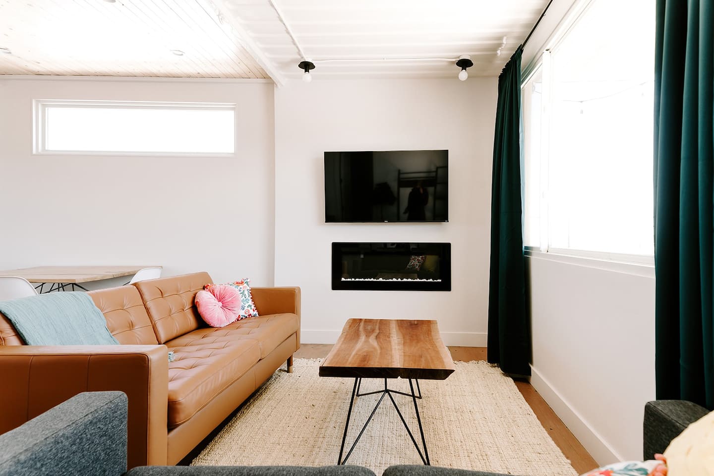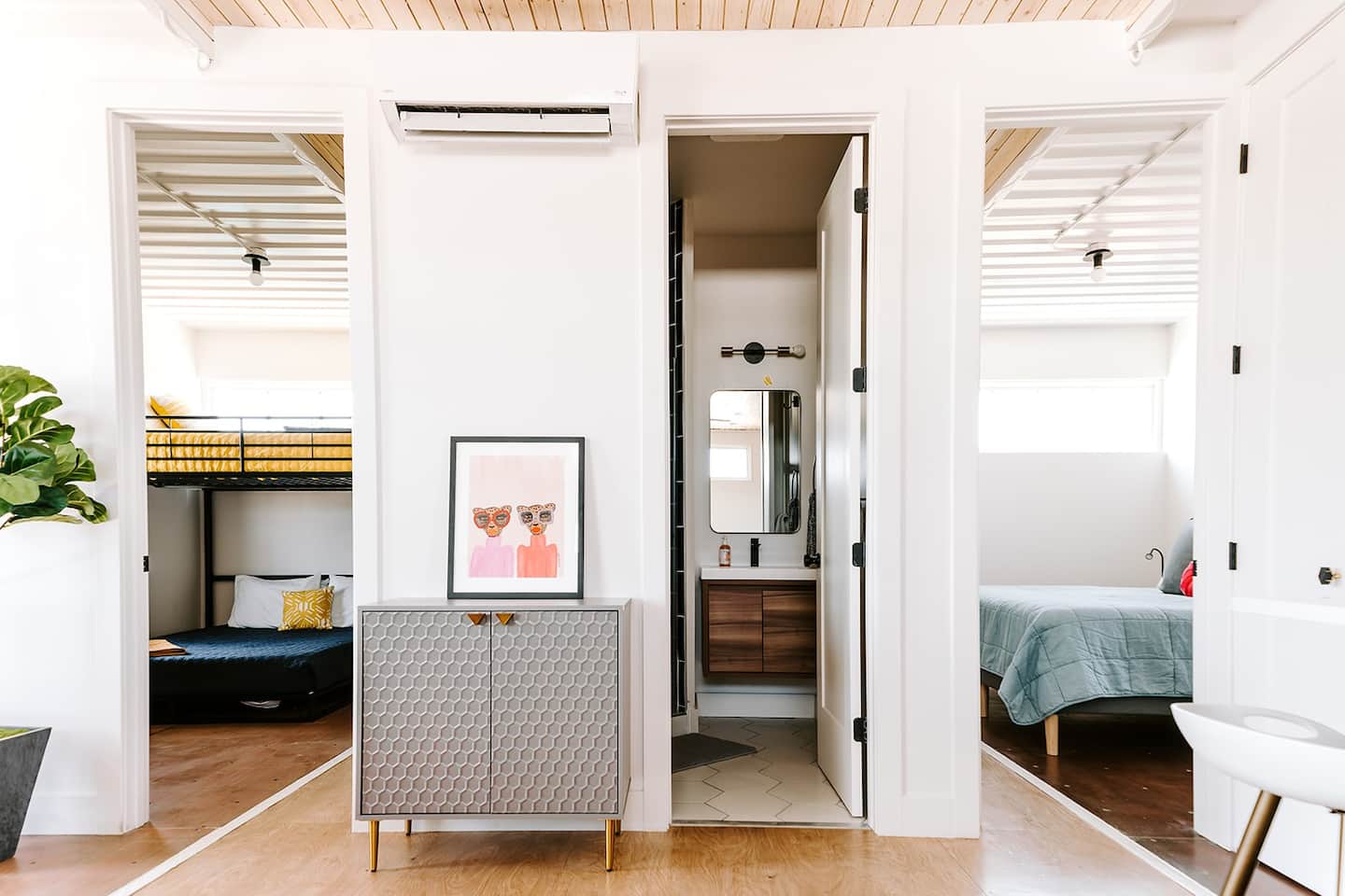 Inside, the design is just as modern and inviting as the main home. A large living room and attached full kitchen serve as the main public spaces. Off to the side is a bathroom with two bedrooms, one of which has bunk beds for extra sleeping capacity.
