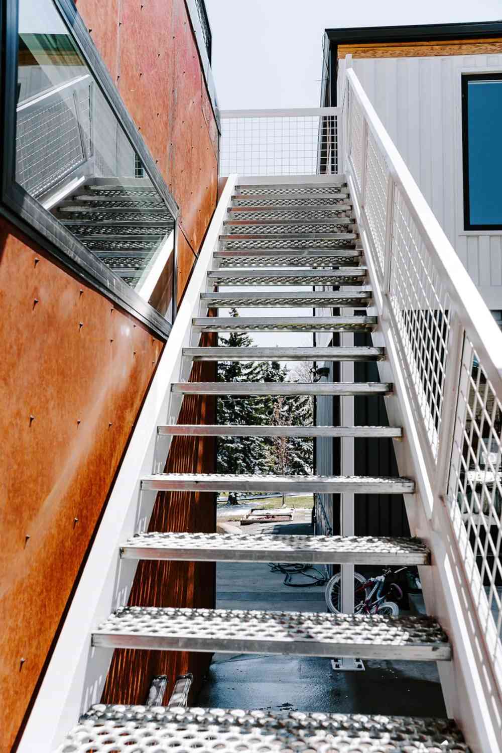 The home’s living room is framed on two sides by the custom staircase and catwalk. The treads of the stairs are wooden laminate while the structure is welded steel. It definitely meshes well with the container’s industrial-chic appearance as it leads you to the rooms on the second floor.