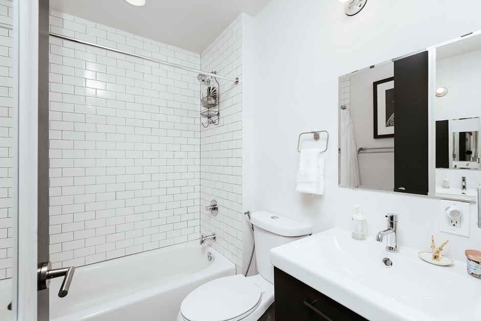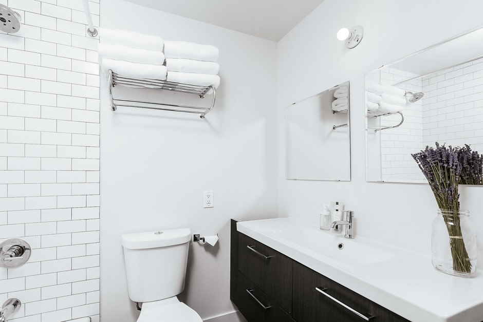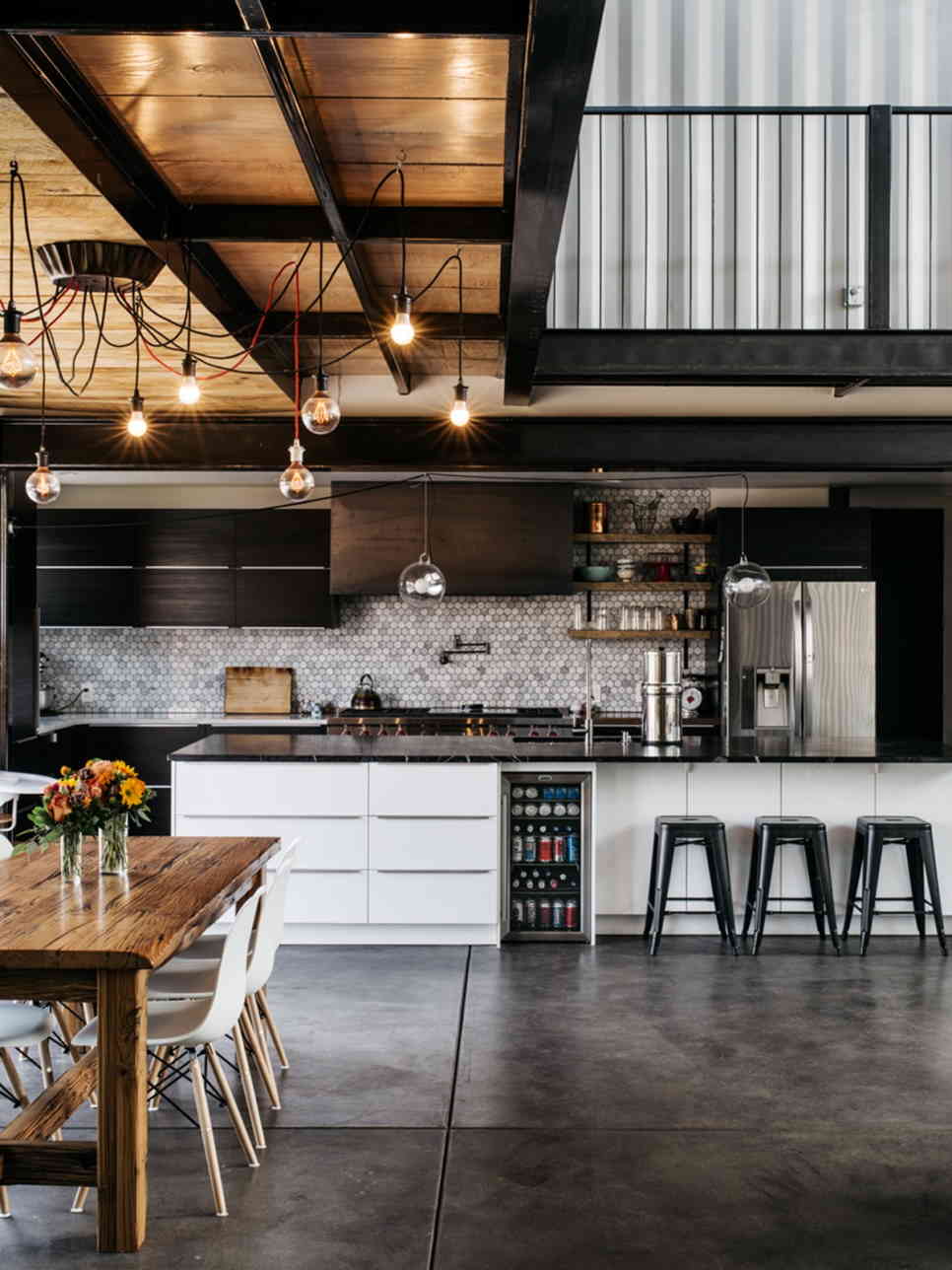 And we can’t forget the kitchen, which is carved out of the side of one container, yet looks out into both the living space and the backyard. With a huge 14-foot long island topped with soapstone, it’s ready to prepare and serve meals for a large party or family event. There’s also some variety here two, with both light and dark cabinets in different locations, and even white quartz and copper countertops along the wall.
