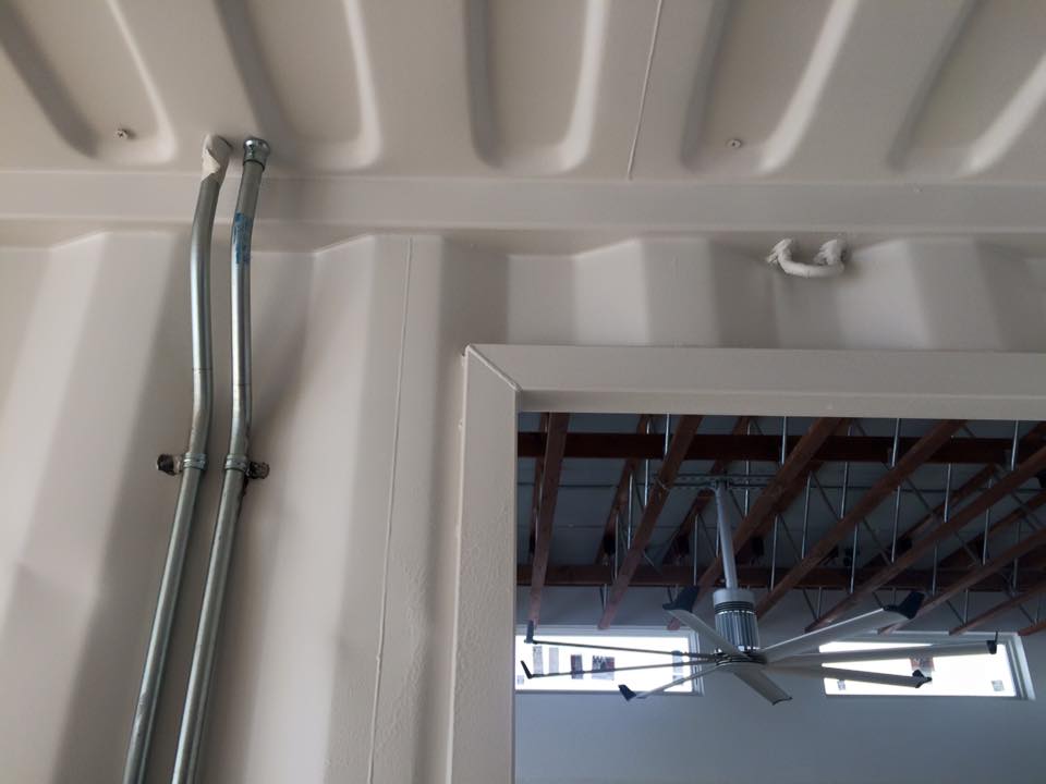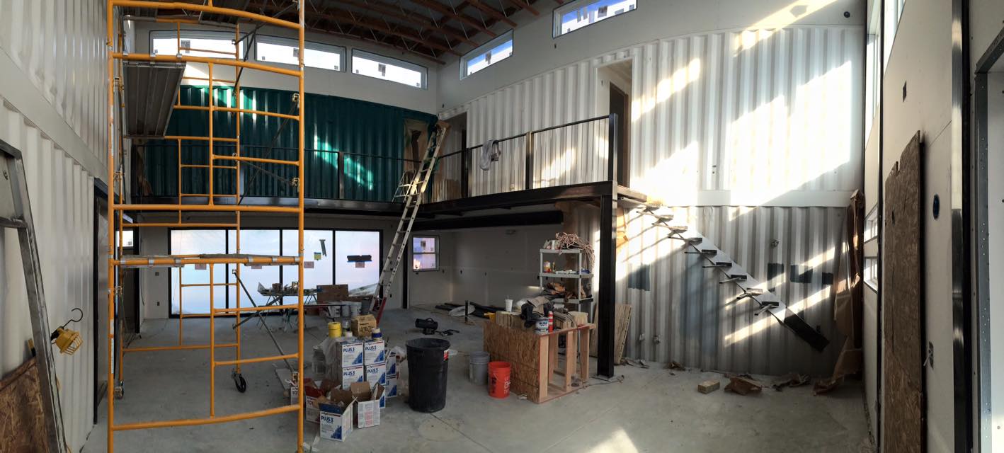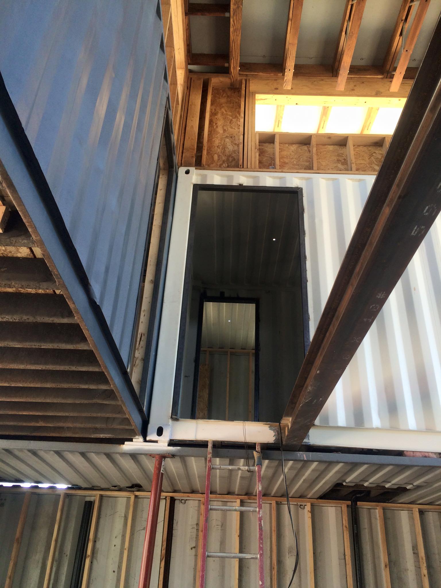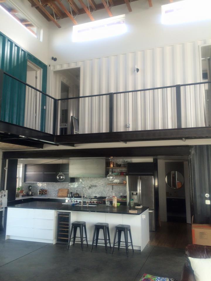 Large roof trusses were set on top of the two container banks and span across the open central space to enclose it. This created the living room, with soaring 25 foot high ceilings and tons of light. The front of the living room has traditional windows plus a custom metal shipping container door that was converted into the front door. The back of the living room has a huge sliding glass door that opens to the backyard.