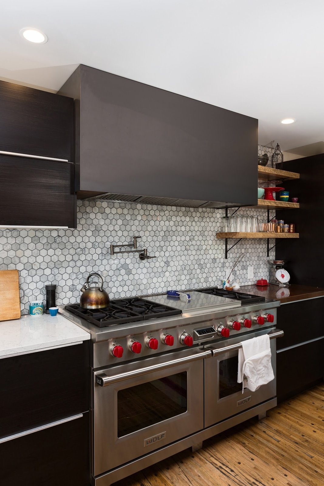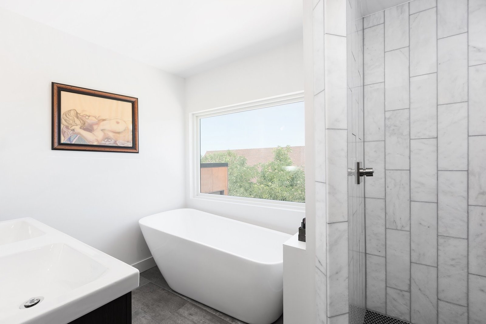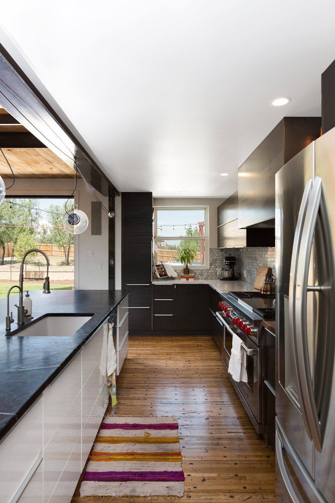 Opening the doors on both ends of this large, central space allow a breeze to blow through the home on nice days, forming a sort of breezeway that is reminiscent of a dogtrot home. But even with the doors closed, you’re still getting tons of light and views of the surrounding neighborhood and mountains beyond.