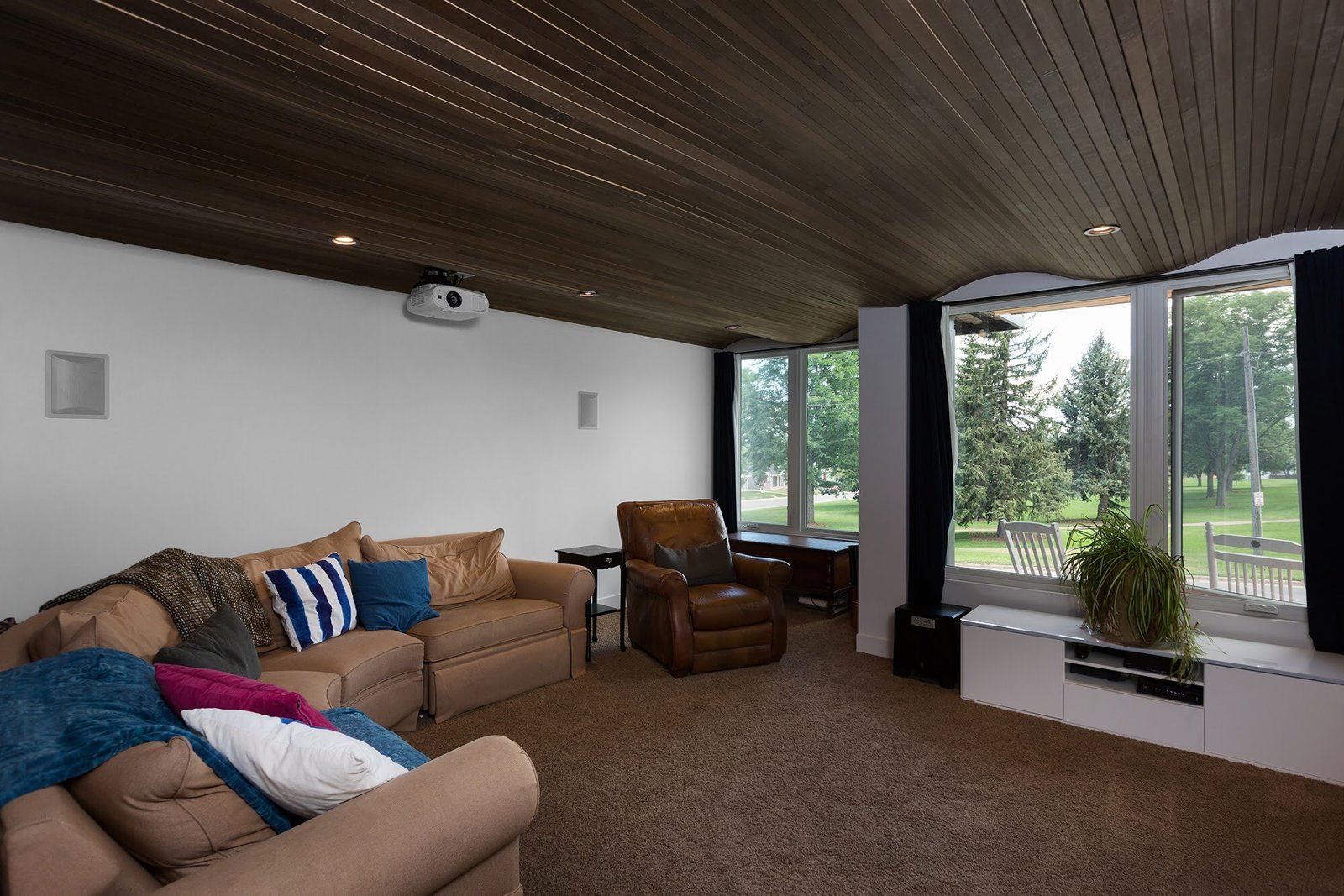 But the containers themselves are also used for functional spaces. In the bottom of the home, to the right of the entrance, a huge media room takes up the width of two containers and uses a curved ceiling with wood slats to give a unique texture. Elsewhere, there are two bedrooms and 1.5 bathrooms downstairs as well.