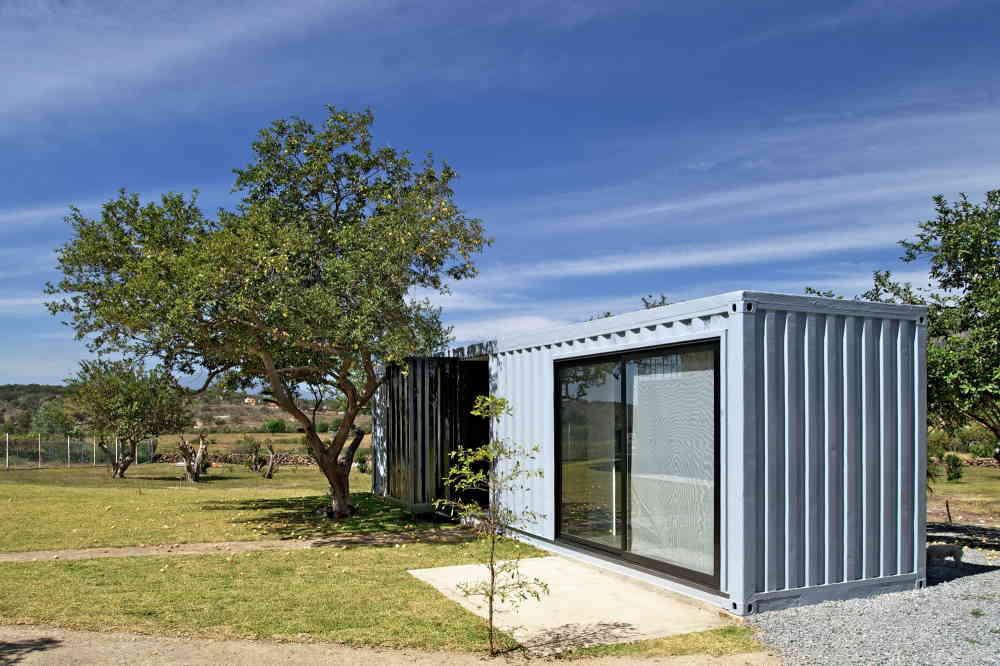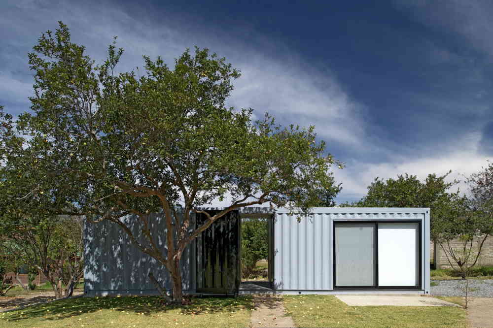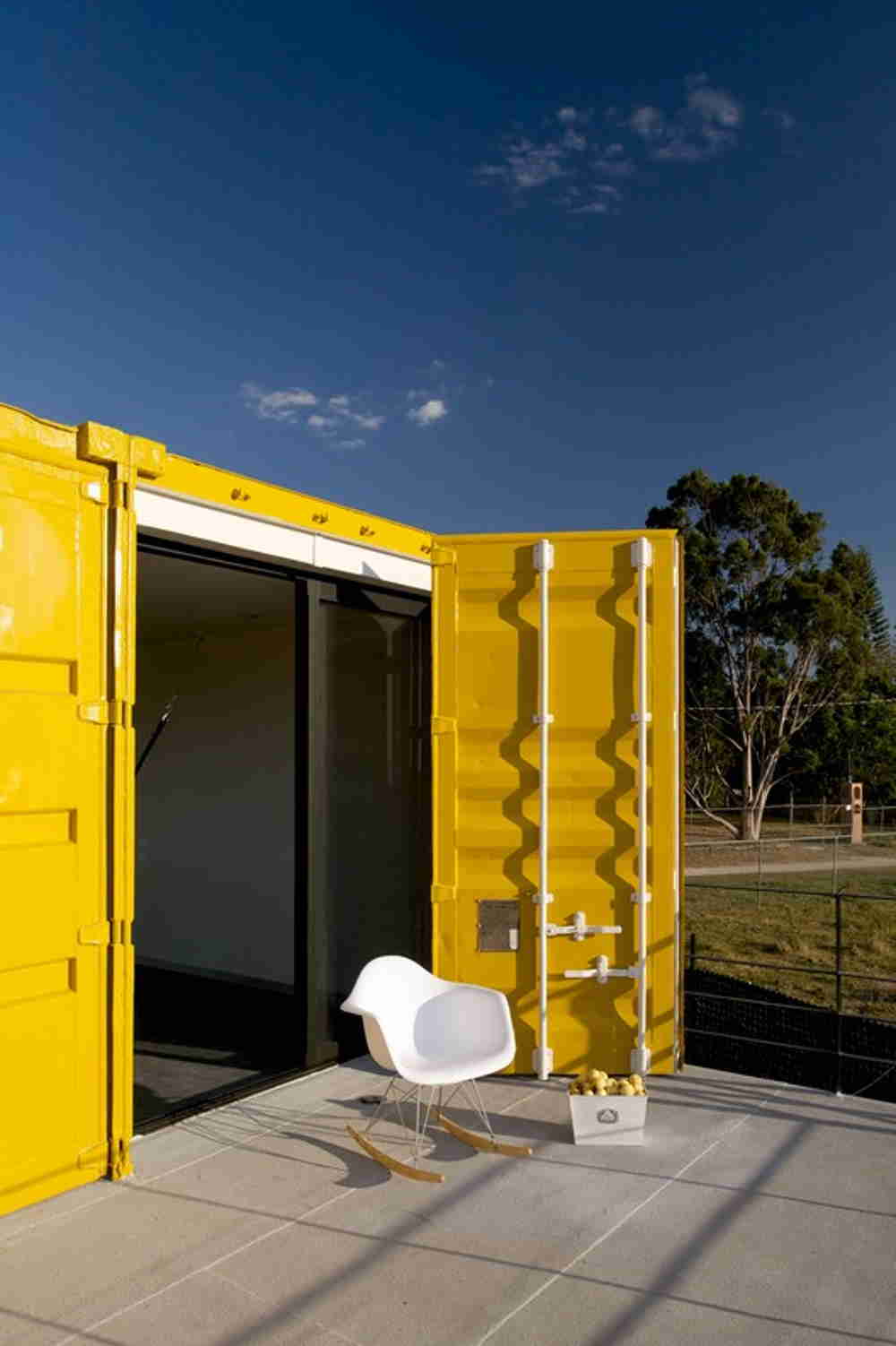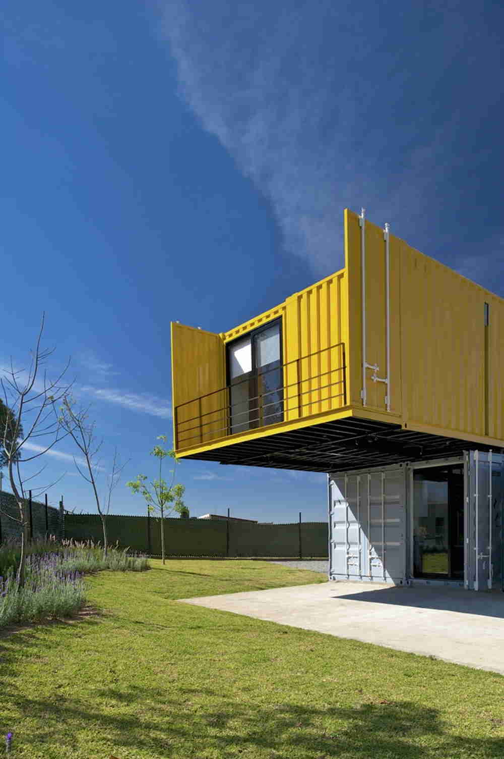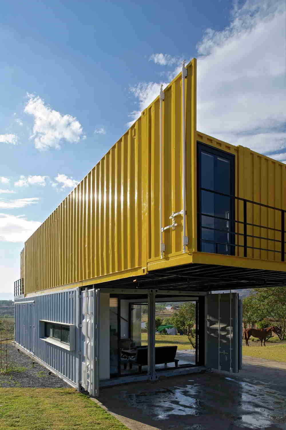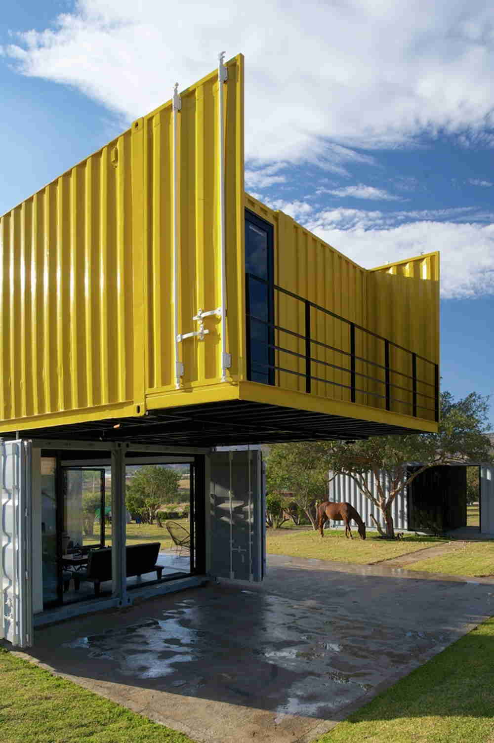 This bold container home is actually two separate structures. The main home is built with four containers, while the guest house with two studios inside is built with a single container.