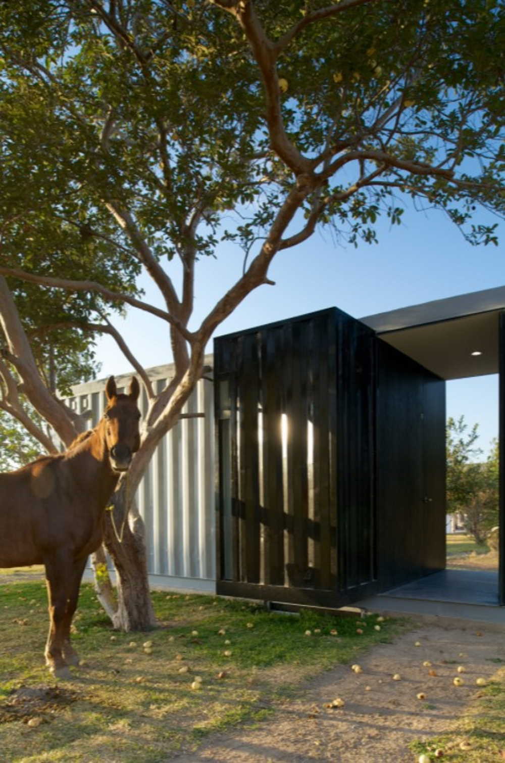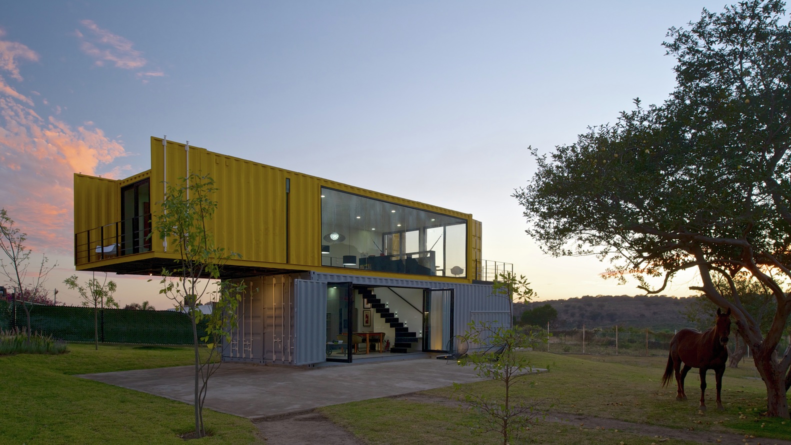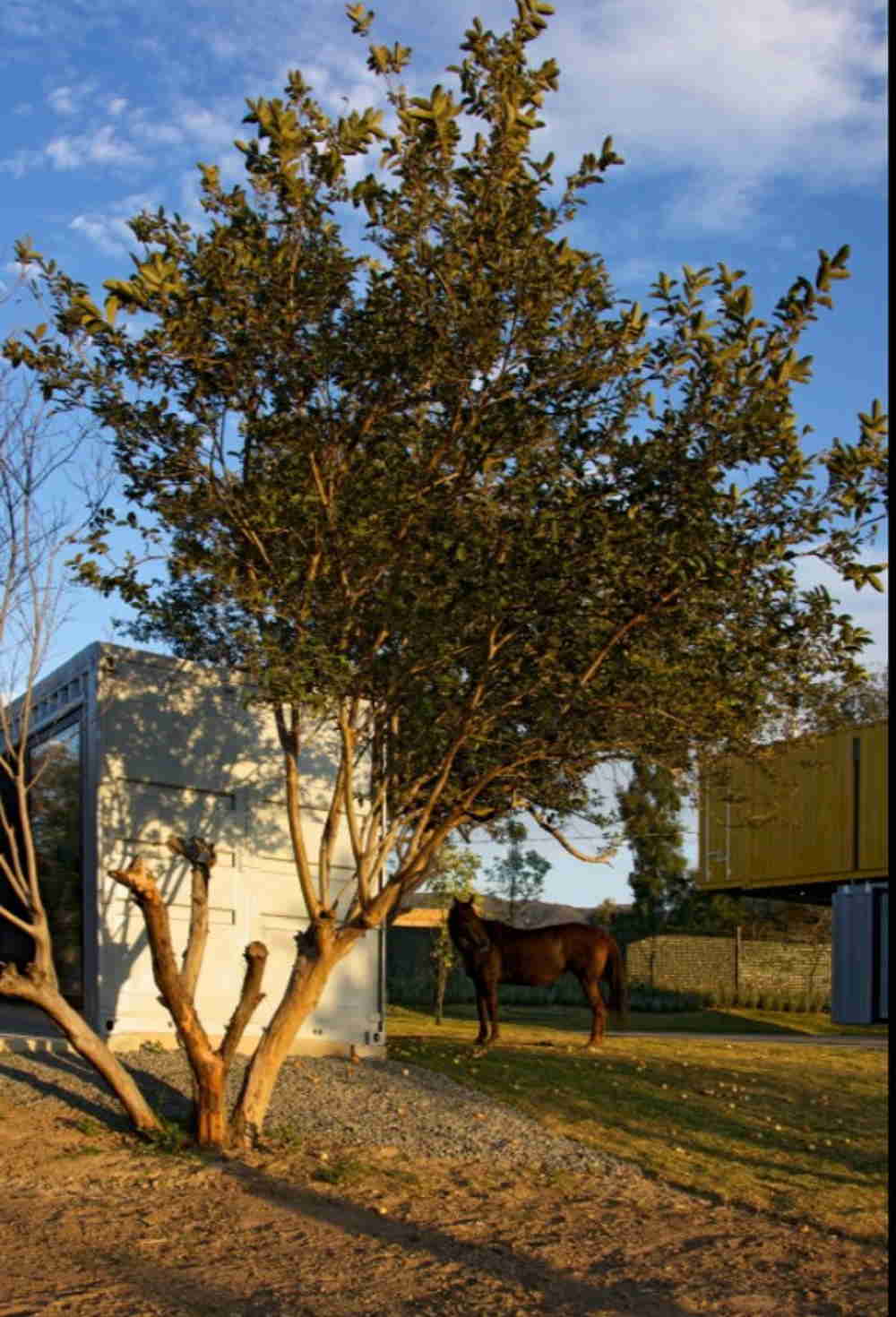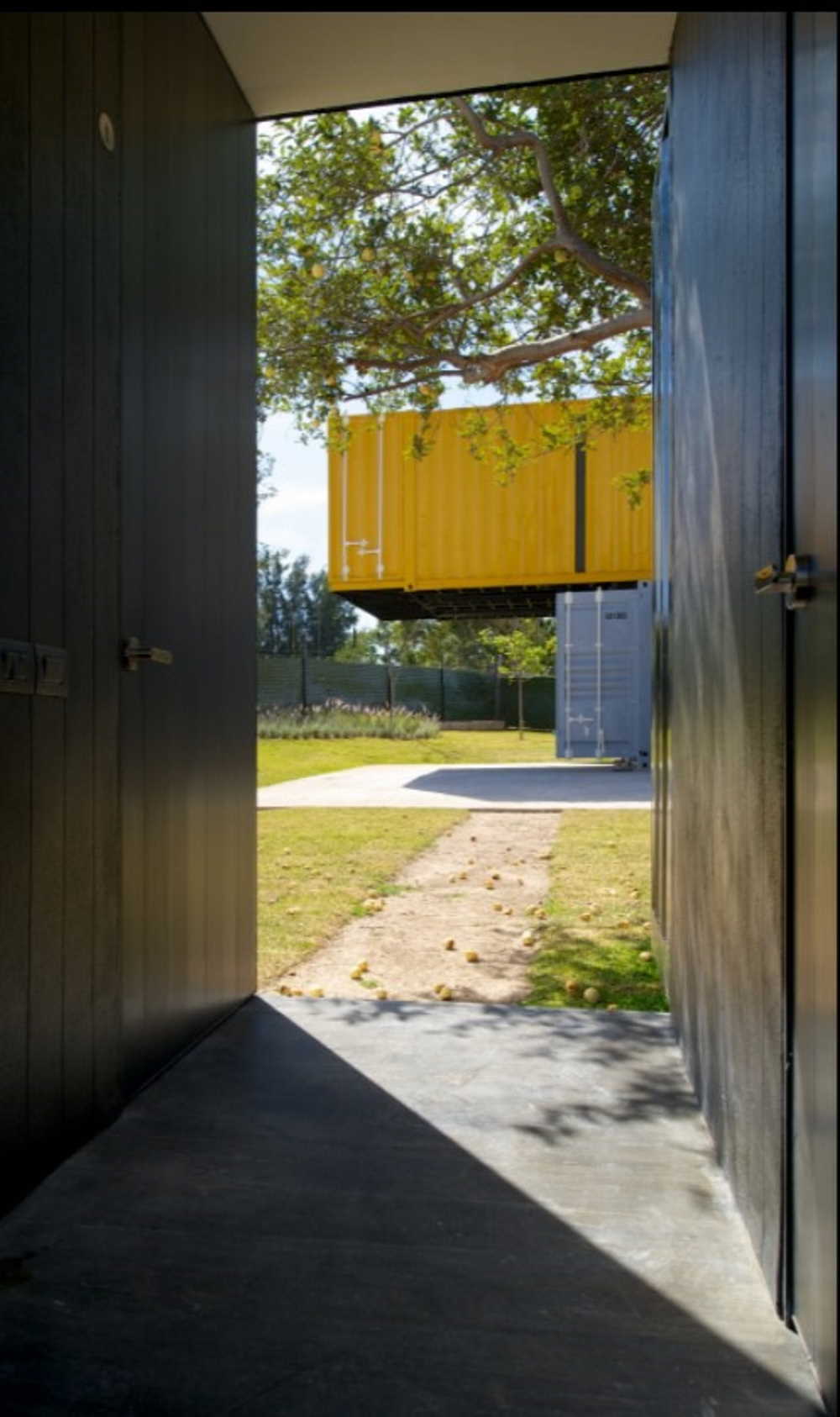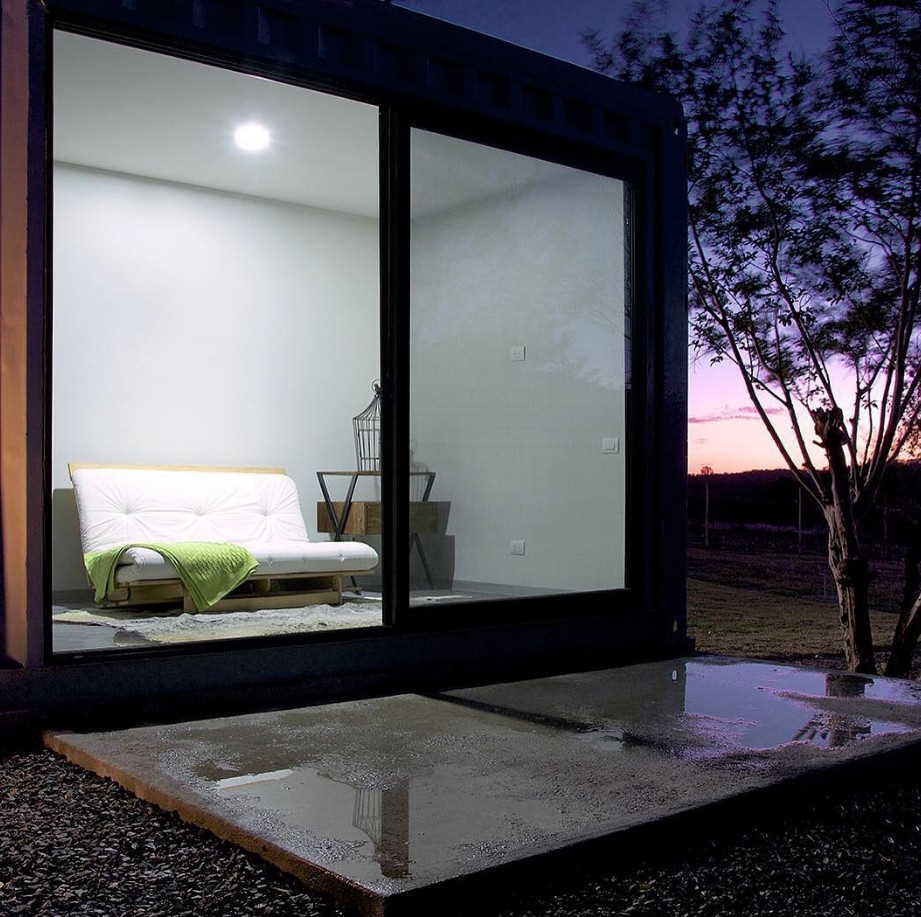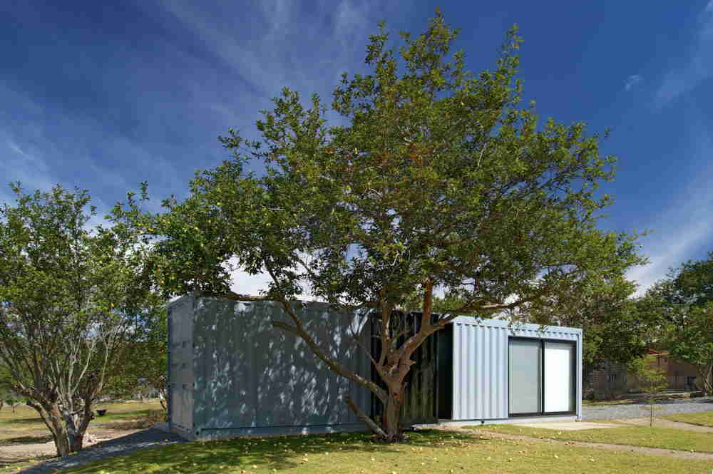 This bold container home is actually two separate structures. The main home is built with four containers, while the guest house with two studios inside is built with a single container.