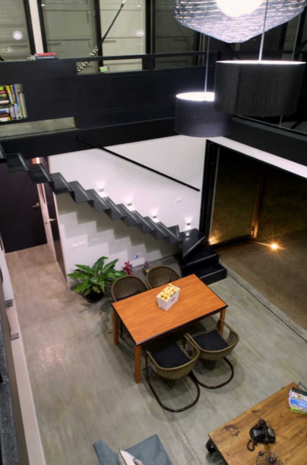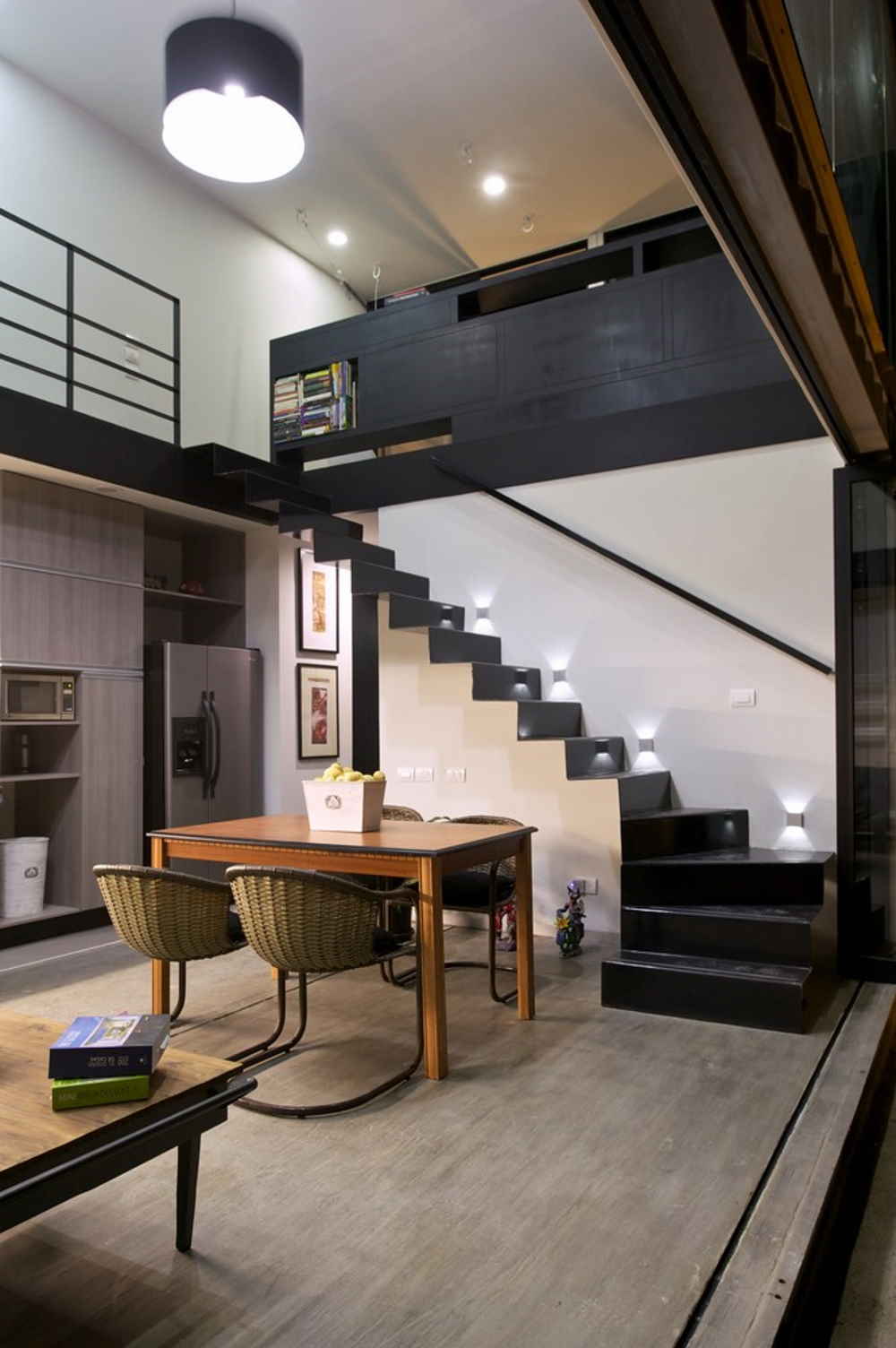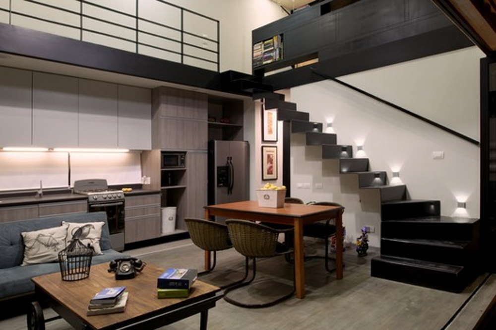 There was a bit of structural engineering work to create this high ceiling (removing the roof of the bottom containers and the floor from the top containers), but as you can see, the results are impressive. This double-height configuration spans effectively the entire area where the two levels intersect with each other.