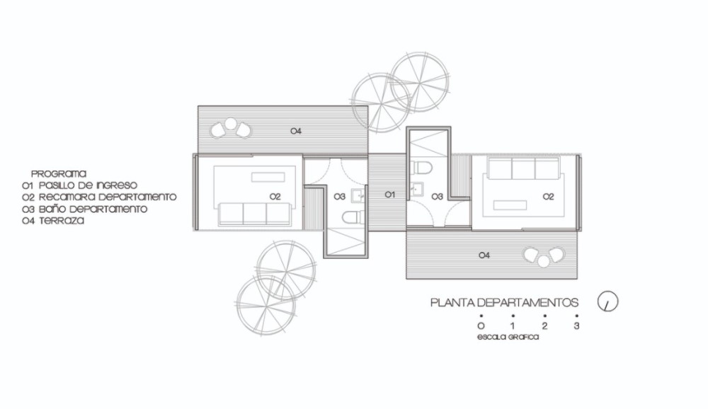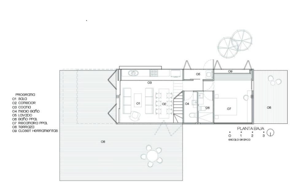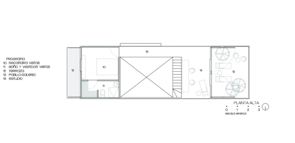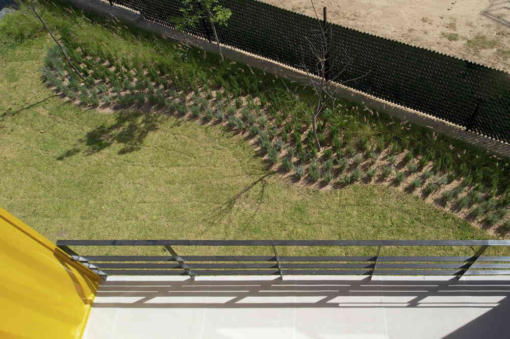 Across the small lawn are the guest studios in the fifth container. This layout makes use of two blow-out areas that give additional width beyond the container’s normal 8 ft in order to fit a shower. The studios are very simple, with a sleeping area, adjacent deck, and bathroom. Everything visitors need for a bit of privacy without wasting space that is better used in the common areas of the main house.