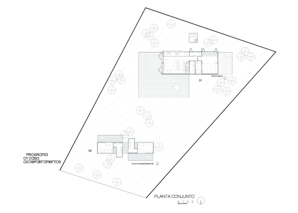 The main home makes use of stacked containers stacked in a two-by-two configuration, with the top-level parallel but slightly shifted over from the bottom level. This gives room for a second-floor deck and a first-floor covered porch.