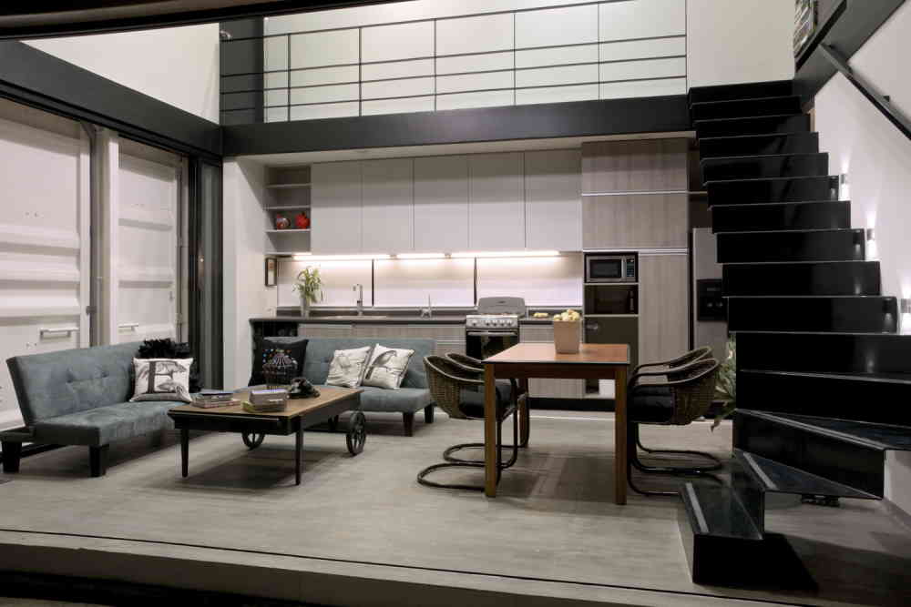 Unlike most two-story container homes, this one actually uses the full height of both containers to create a raised ceiling. As you can see in the pictures, the living area feels huge, not just because of the large windows, but also because of the double-height interior ceiling.