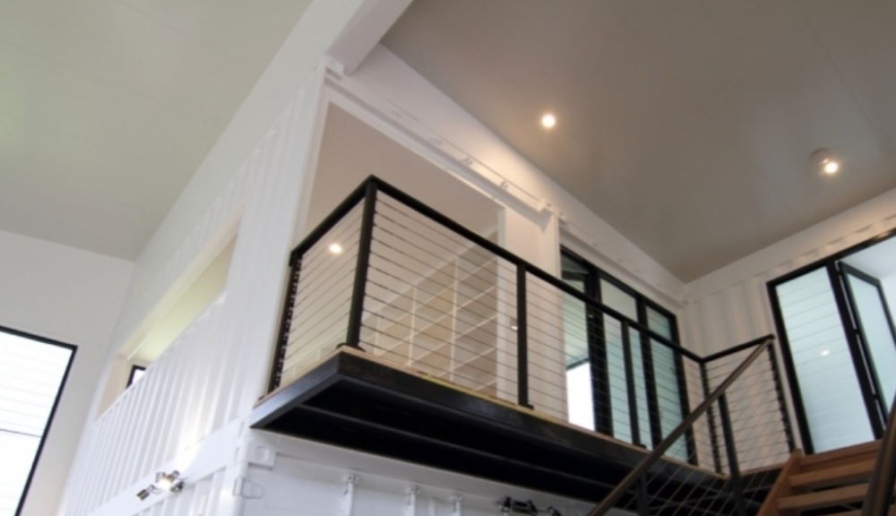 The public areas, like the living and dining room, aren’t in containers at all. Rather, the home has an expansive concrete pad between all the containers that holds these rooms. With a huge roof covering all the containers, these larger public spaces end up with 16ft ceilings.