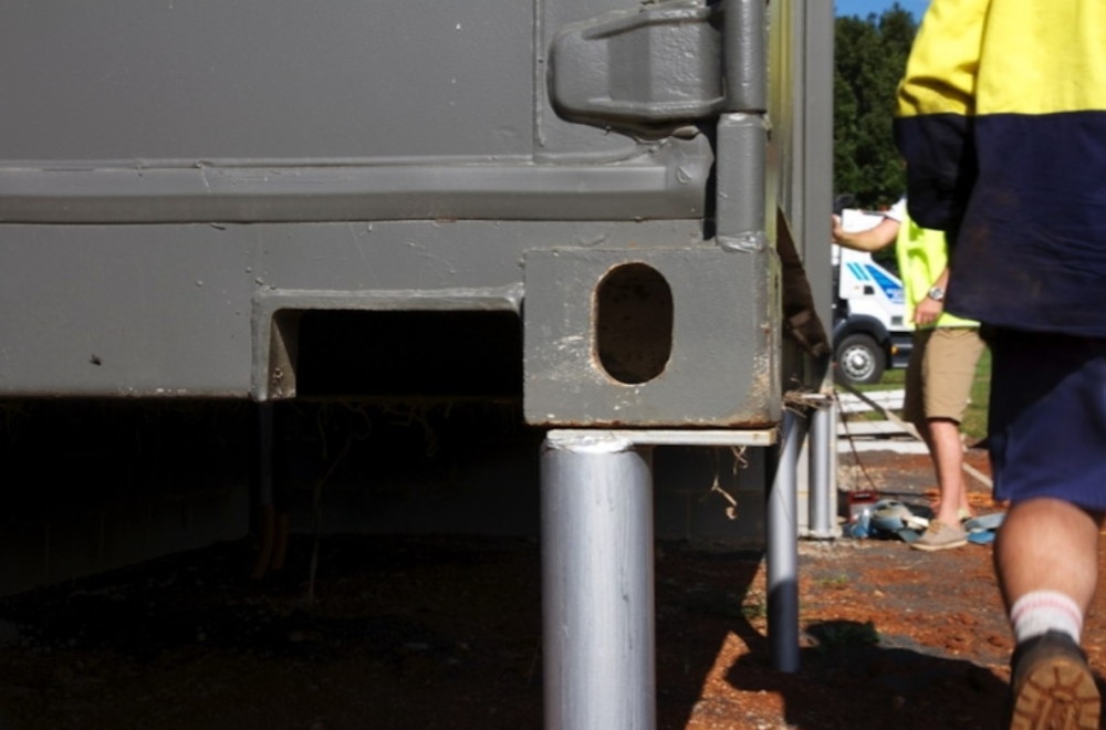 The home is notable not only for its appearance but also for its foundation. While a concrete slab is used for the central area, the container themselves actually sit on metal piers as can be seen in the photos.