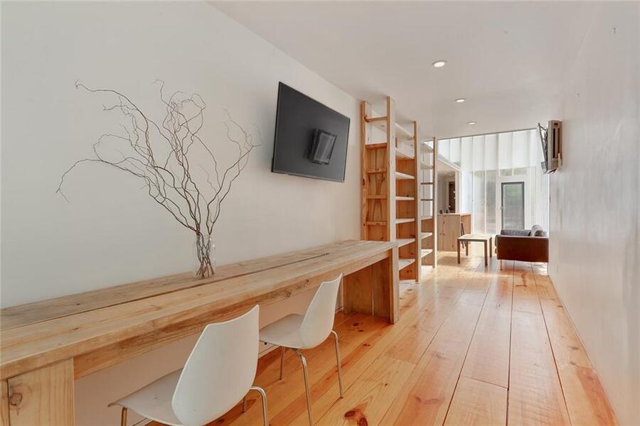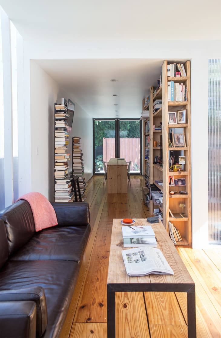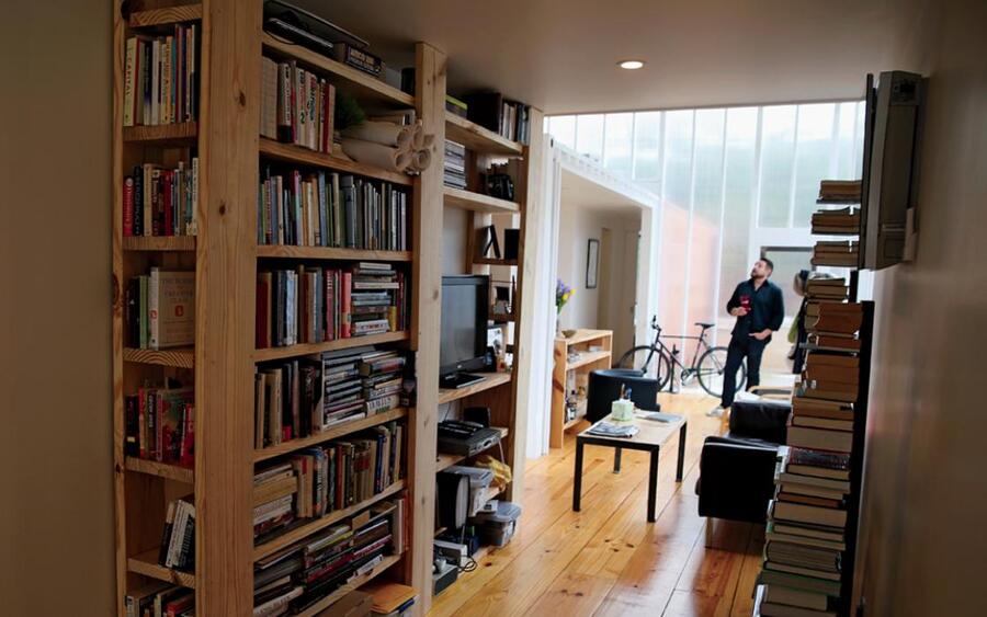 The owners wanted to ensure that despite the small footprint of the home, they still had room for some of their favorite possessions. In addition to the 4-ft high storage loft above the kitchen container, they also have tons of shelving to hold their 400 books and an expansive 10-foot-long desk for working.