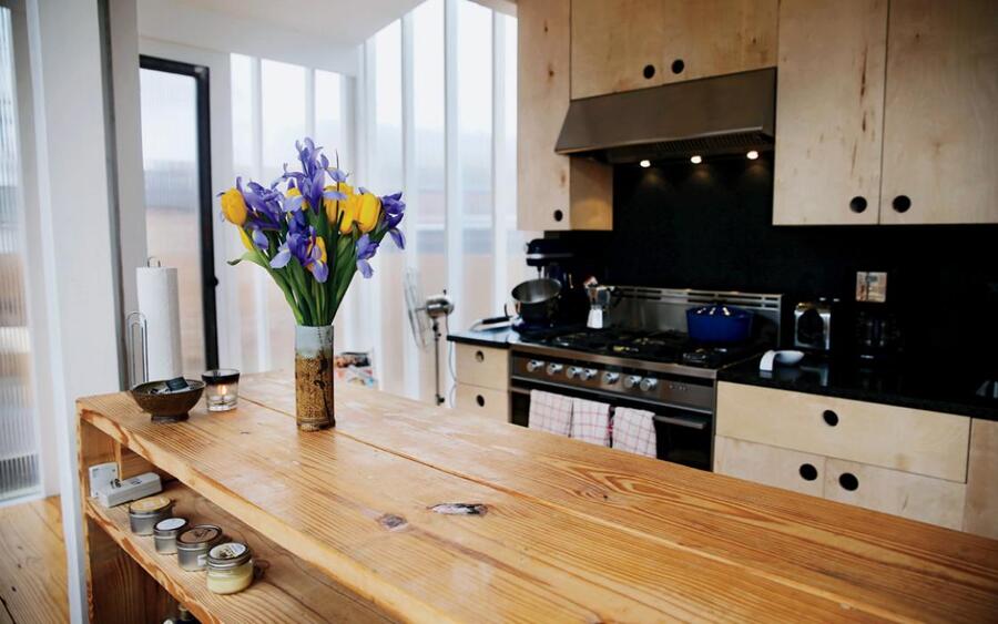 As we previously mentioned, the owners also knew that since they were giving up floor space, they wanted to use some higher-end materials in the home. The floors and furniture were crafted from finished 2×12 pine boards that look surprisingly elegant up against the white walls. They went with a Carrara marble in the bathroom, while the kitchen includes white granite countertops and a Fisher Paykel five-burner range.