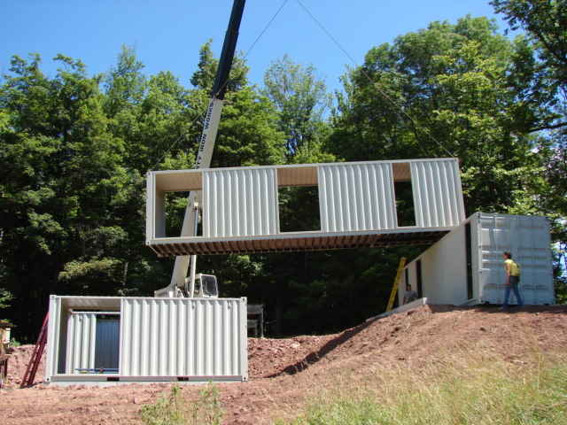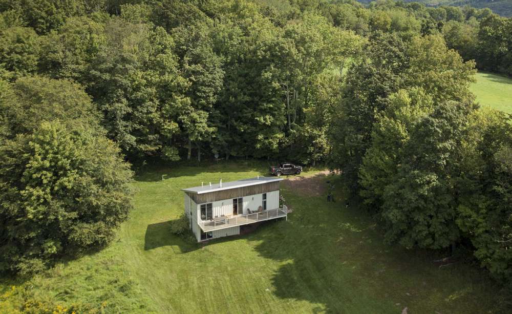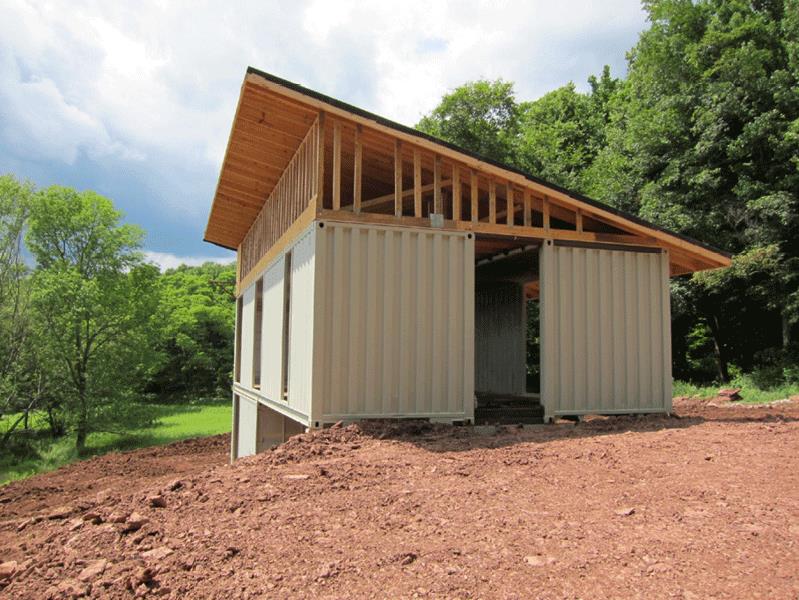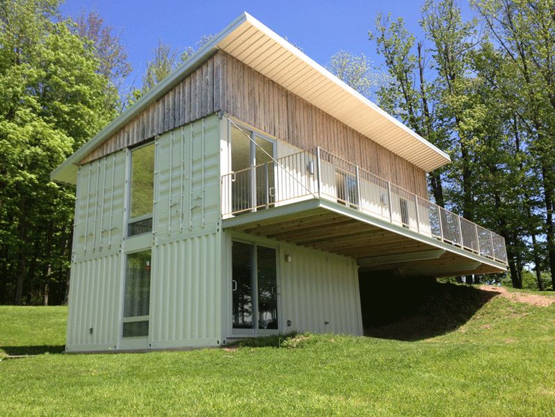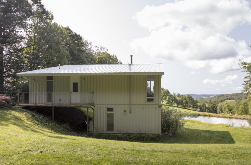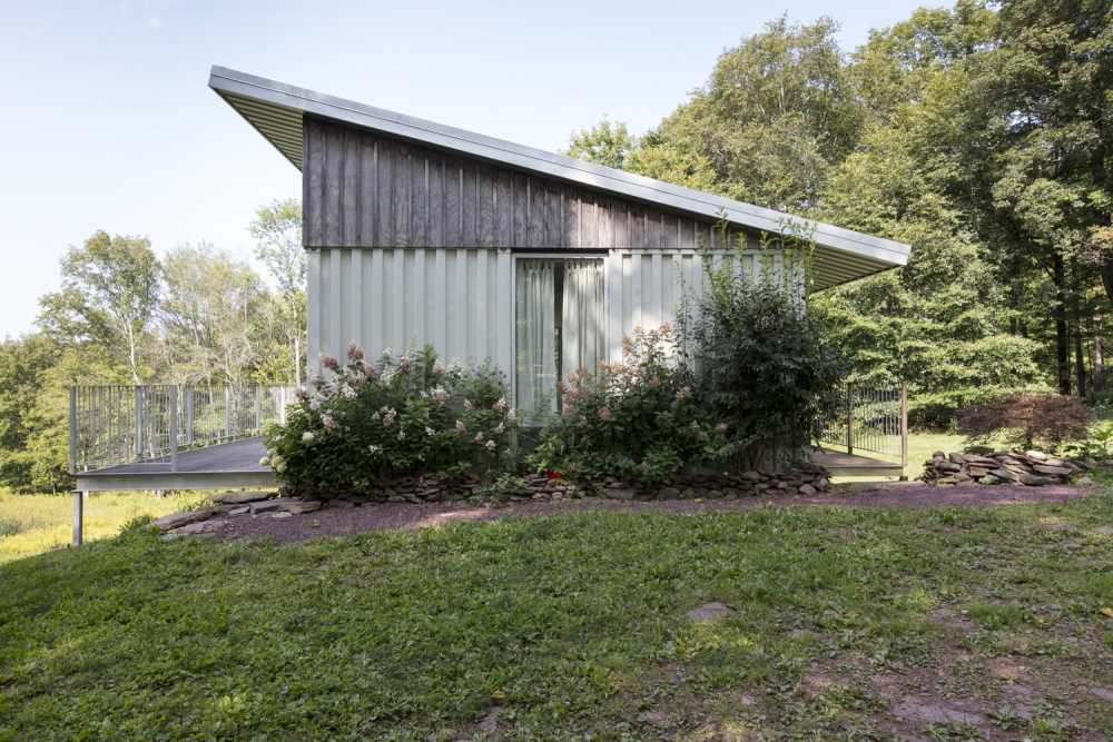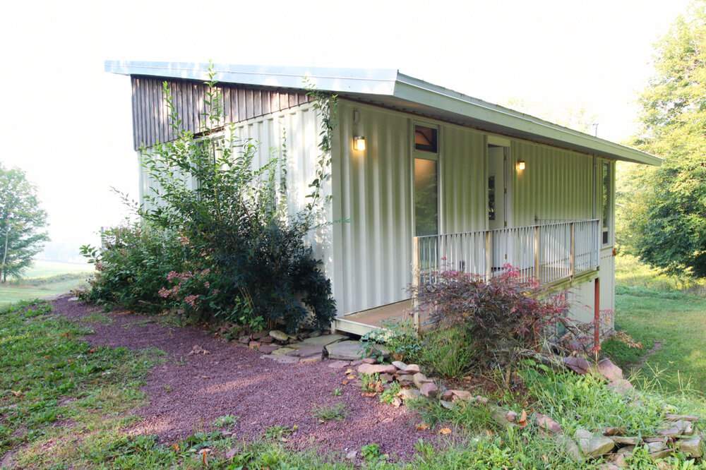 If this house looks familiar, perhaps you’ve seen the Livingston Manor Container Home. Roughly 10 miles away, these two homes were created by the same designer/builder team and have somewhat similar hillside designs.