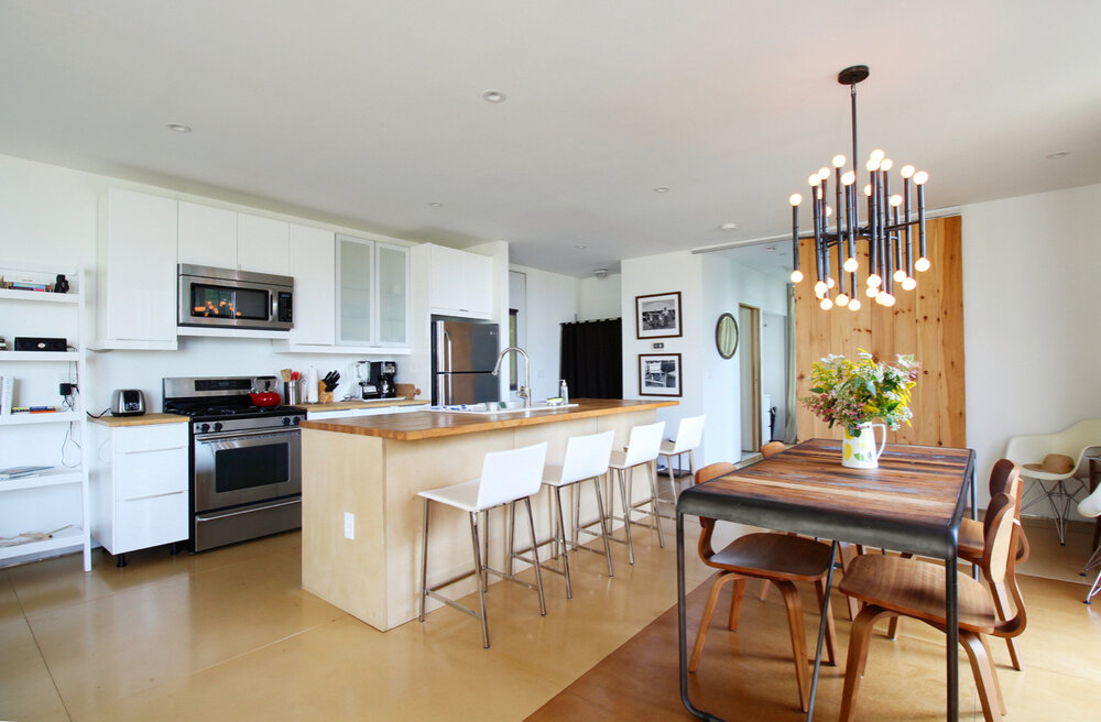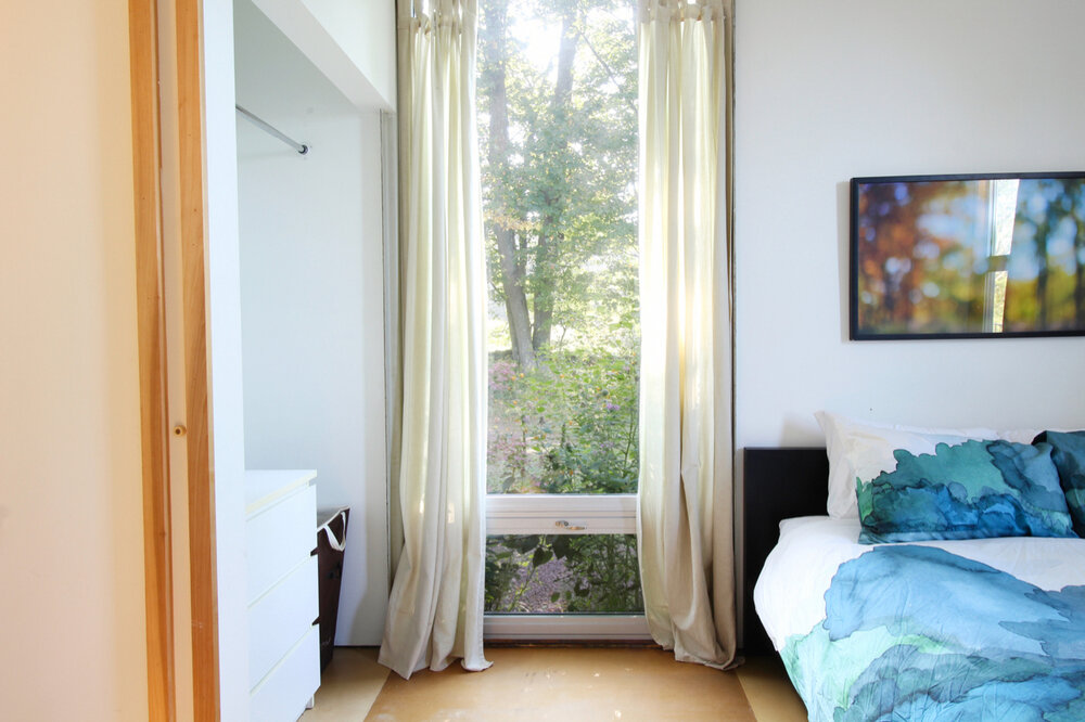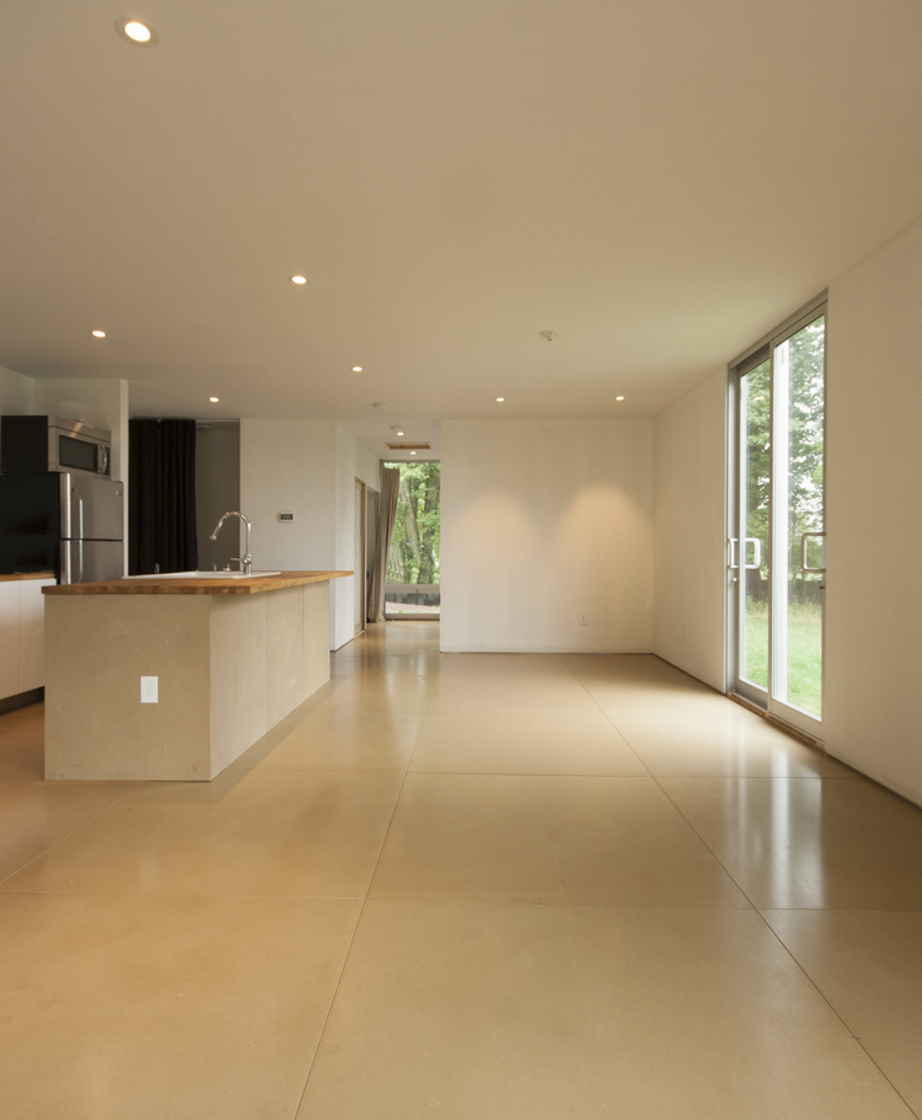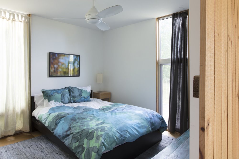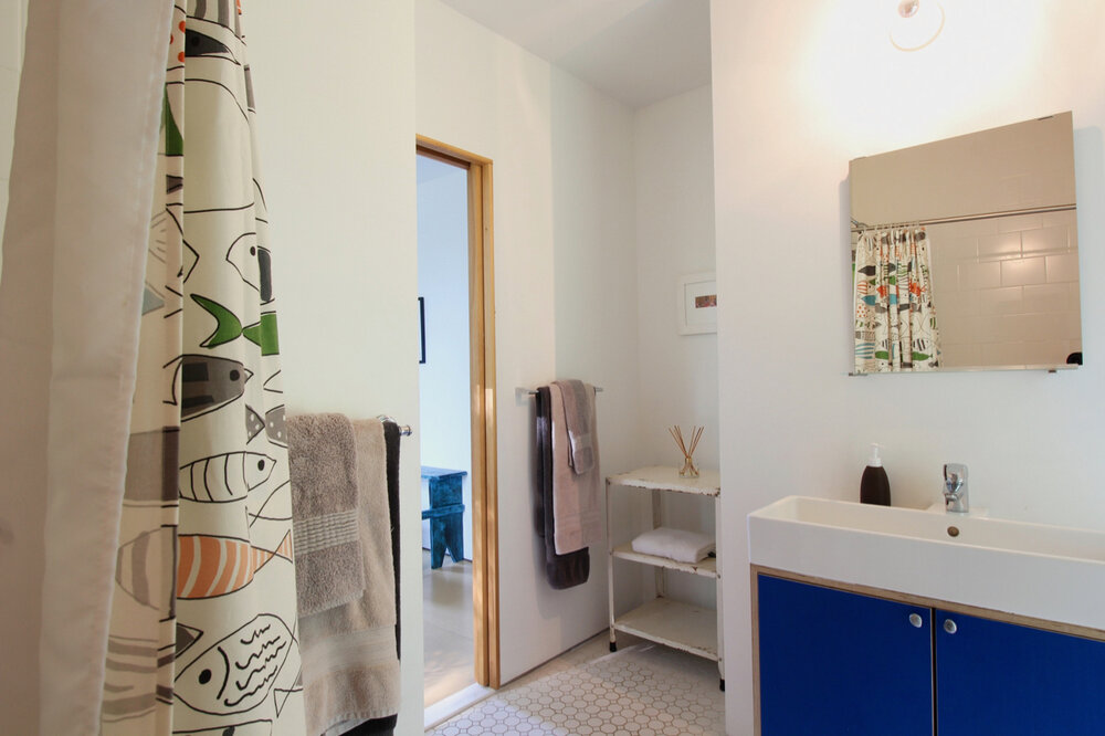 The first floor of the home is built from two twenty-foot shipping containers, set four feet apart and resting on a concrete perimeter foundation. This is where the guest bedroom and bathroom are located, as well as the laundry and mechanical systems.