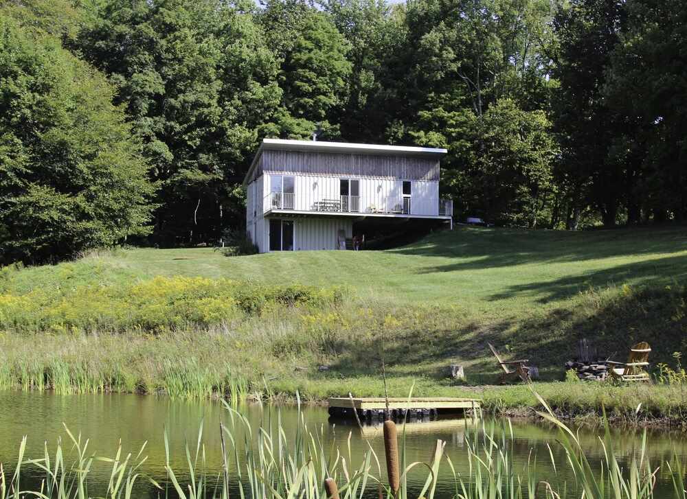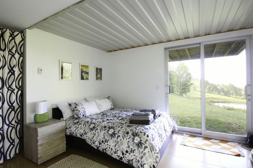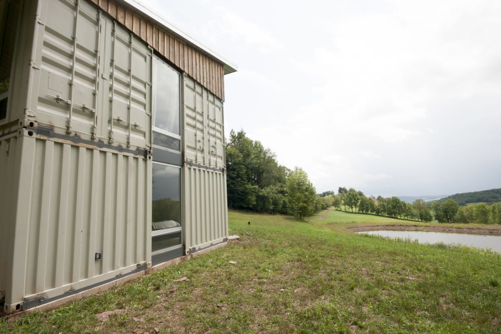 This country container home is well integrated into the six acres of land that surrounds it. As we mentioned, it’s built on to the side of a small hill, then juts out into the open air. The home sits in a grassy clearing that includes a tranquil fourteen-foot-deep pond, while the periphery of the property also includes bountiful mature trees.