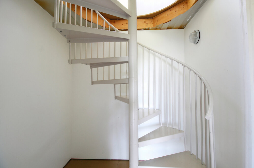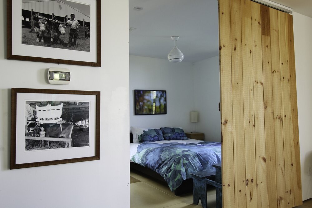 The interior also has the modern feel we normally see with container houses, including white cabinets, wooden barn doors, and creative fixtures. When you walk into the home from the main entrance, you have the kitchen and living spaces open in front of you to the right, so those southern views of the pond are available to everyone. To your left is the master suite. In the NW corner of the home you’ll find the spiral staircase that takes you to the guest suite below.