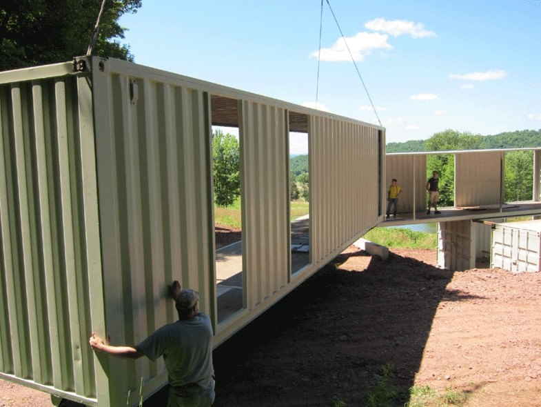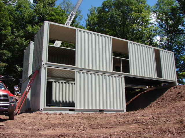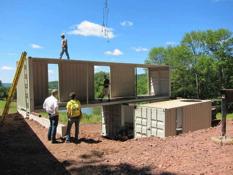 In the tiny village of North Branch, New York, you will find a special two-story container home built onto the side of a small hill. The North Branch Container Home makes use of four shipping containers stacked on two levels and separated into two parallel banks.