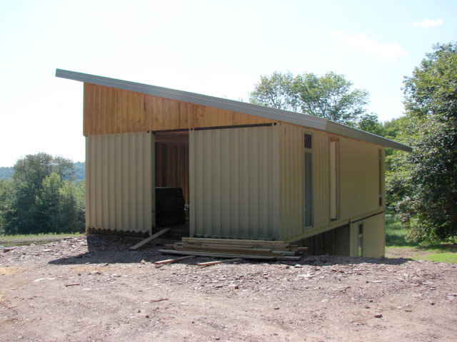 Tying the two banks of containers together is the large, sloping roof. Built with wooden trusses that space across both containers, the roof provides additional area for insulation and has a generous slop to help with winter snow accumulation.