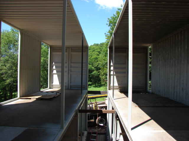 Thanks to the filled-in four-foot gap between the two sets of containers, the floor areas on each level were expanded. The first floor would be 320 square feet with just containers, but ends up at about 400 square feet. The second floor would be 640 square feet with just containers, but is now actually 800 square feet.
