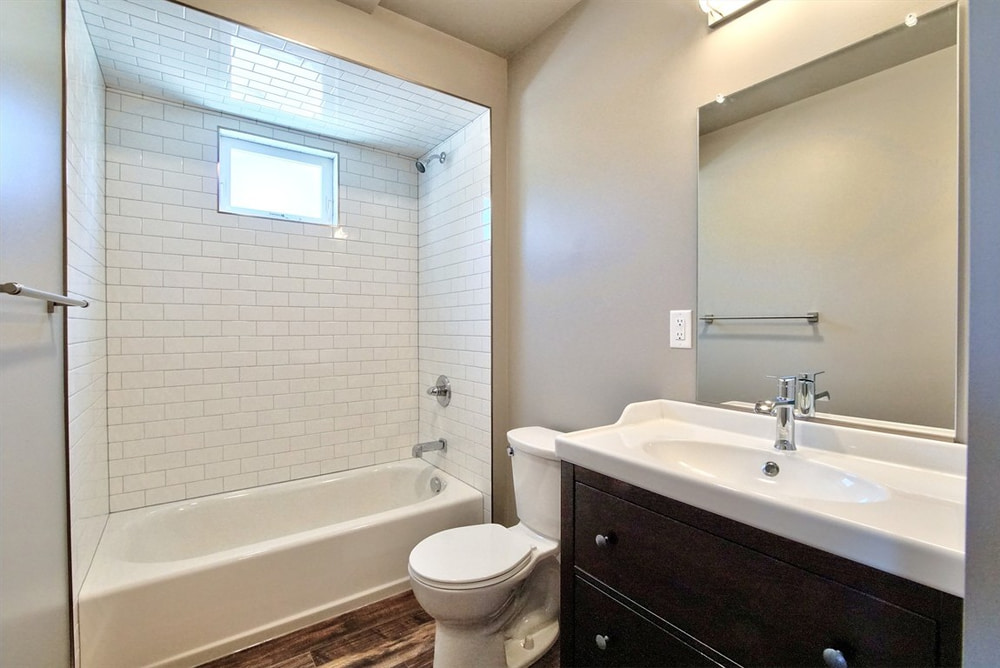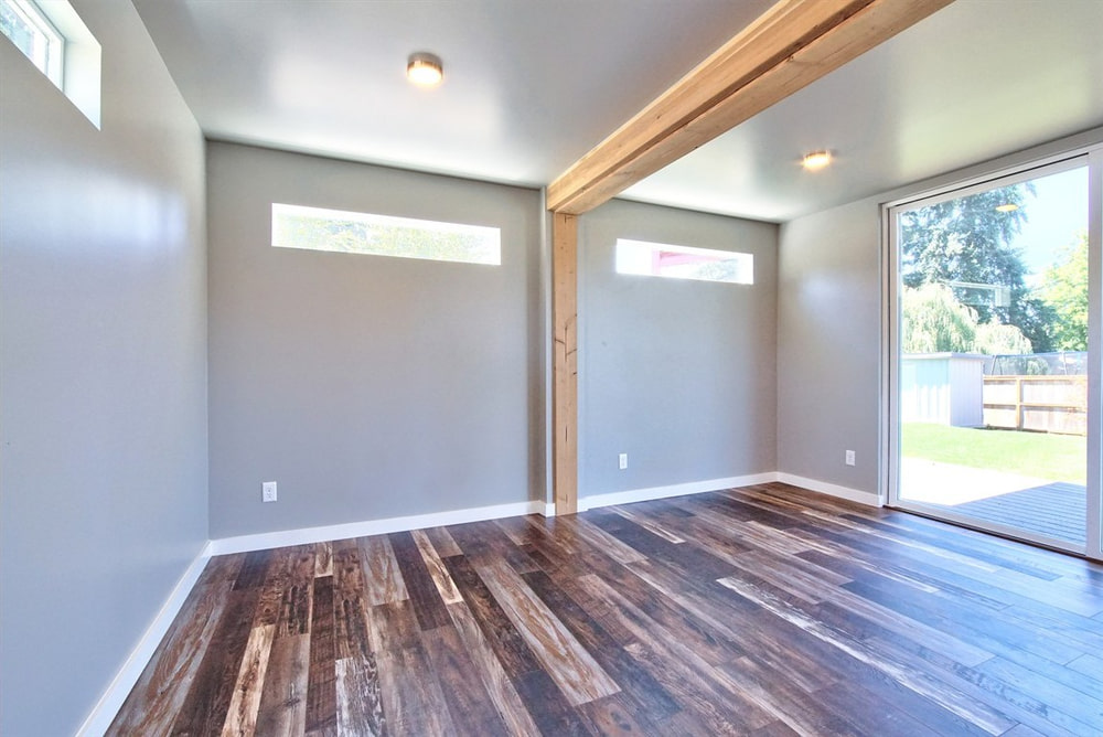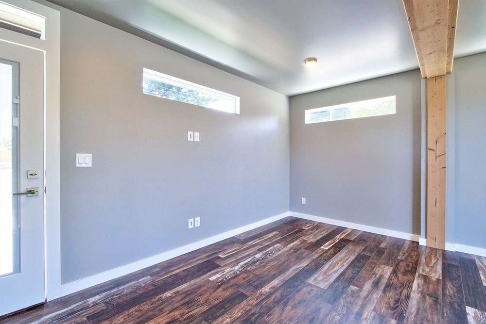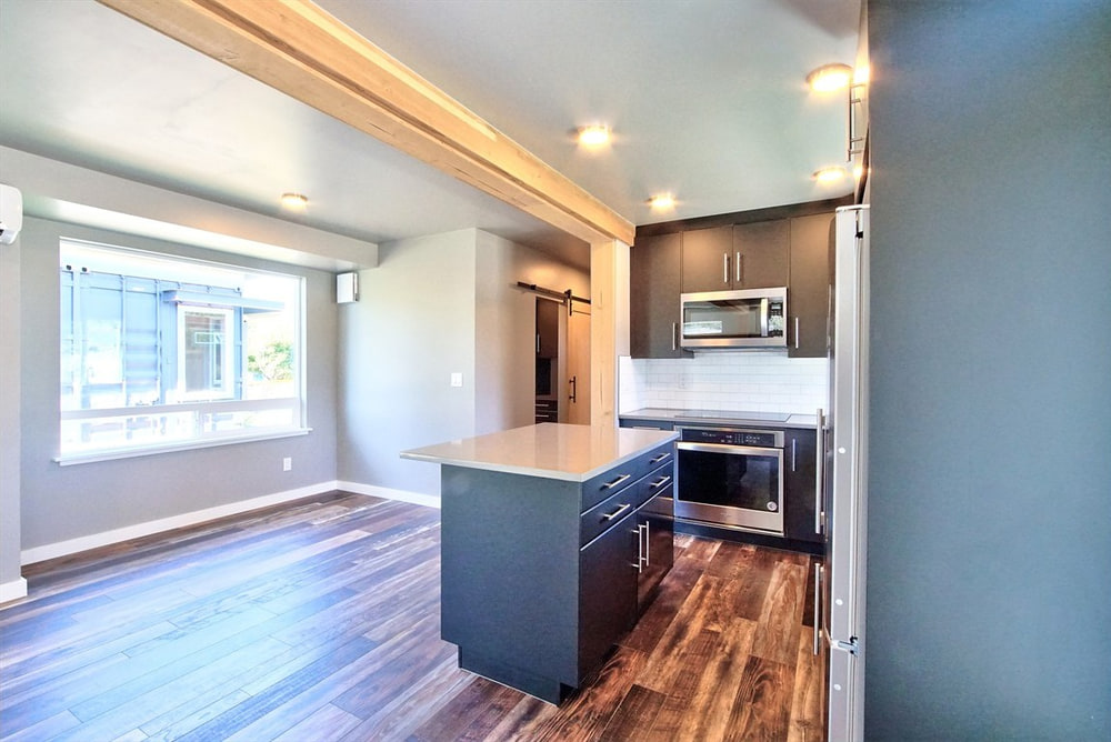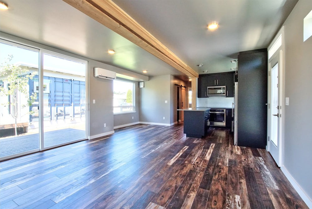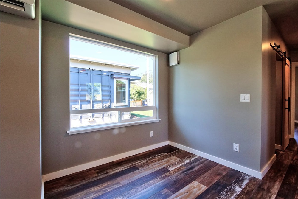 One of the three container houses, 291 Warner Street, is a residence crafted from a combination of two parallel 45-foot shipping containers. These slightly longer-than-normal containers have a completely rectangular floorplan save for a few strategic bump-areas where the walls were extended outward to provide extra interior space.