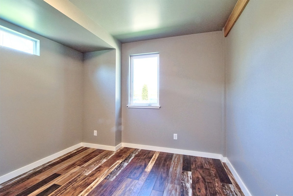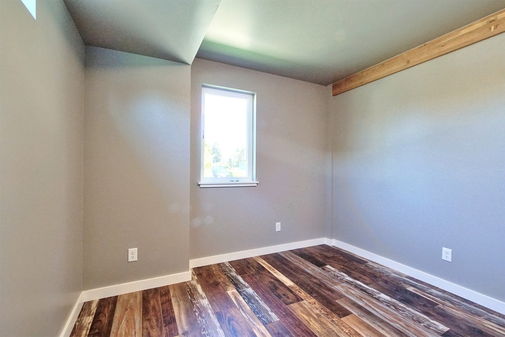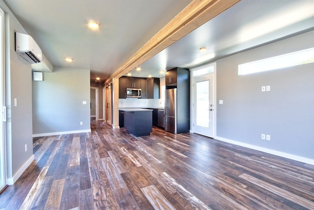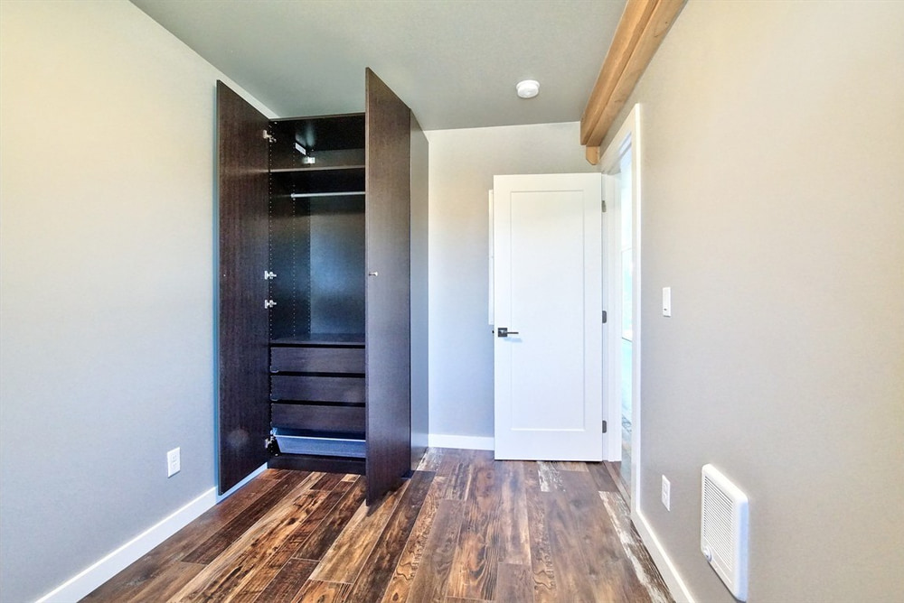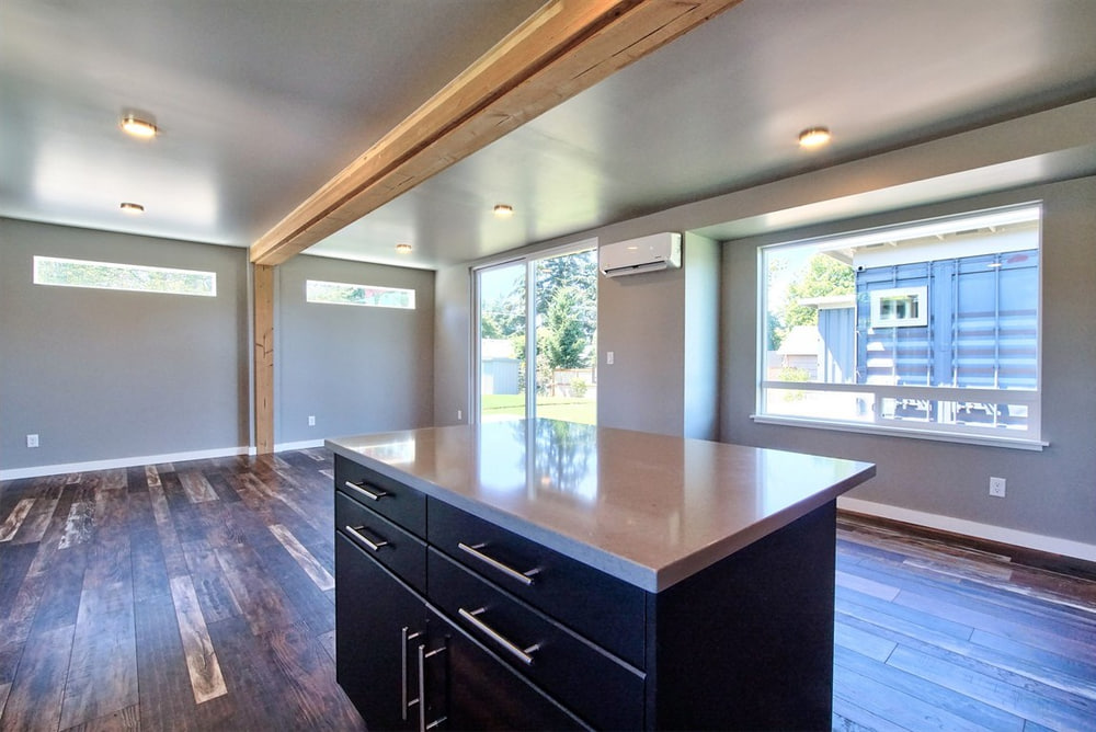 Inside this container home, you’re greeted by a generous open living and kitchen area that makes the home feel larger than it actually is. And the many windows only add to the airy feel. The home also includes two bedrooms and a bathroom, plus a small utility room.