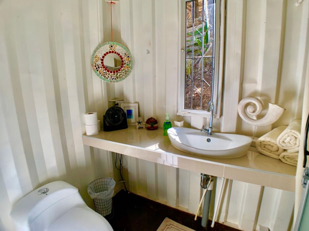 The house is arranged simply: two 20 ft containers spaced roughly 24 feet apart and lying parallel to each other. Each container holds a bedroom with an ensuite bathroom.